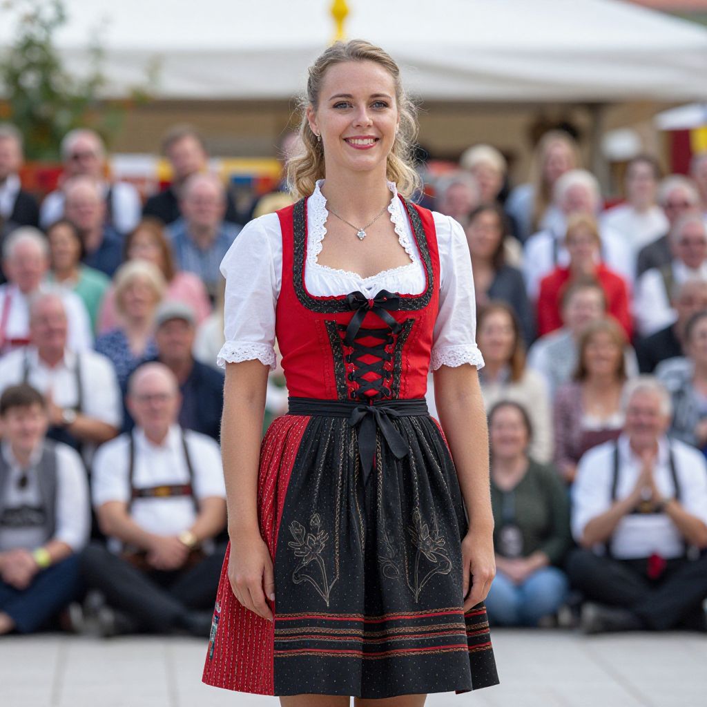 Photograph of a smiling blonde woman in traditional Bavarian dress with red bodice, black skirt, white blouse, and lace-up front, standing in