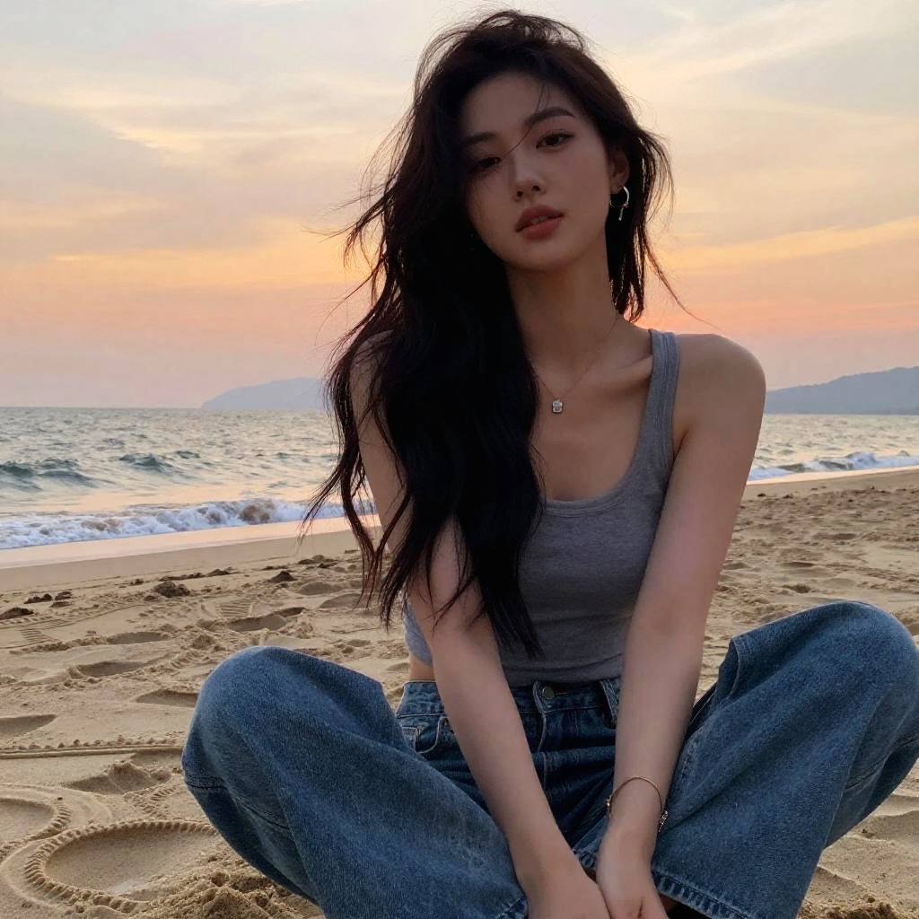 Photograph of a young woman with long, wet brown hair, sitting by a bright blue ocean. She's wearing a pink swimsuit and a white shell necklace, sipping an orange drink through a straw from a clear glass. Her skin is lightly tanned, and she's looking directly at the camera with a relaxed, slightly playful expression. The background is a blur of blue water.
