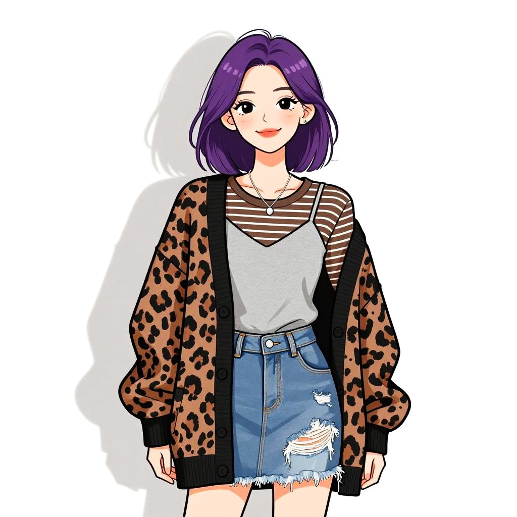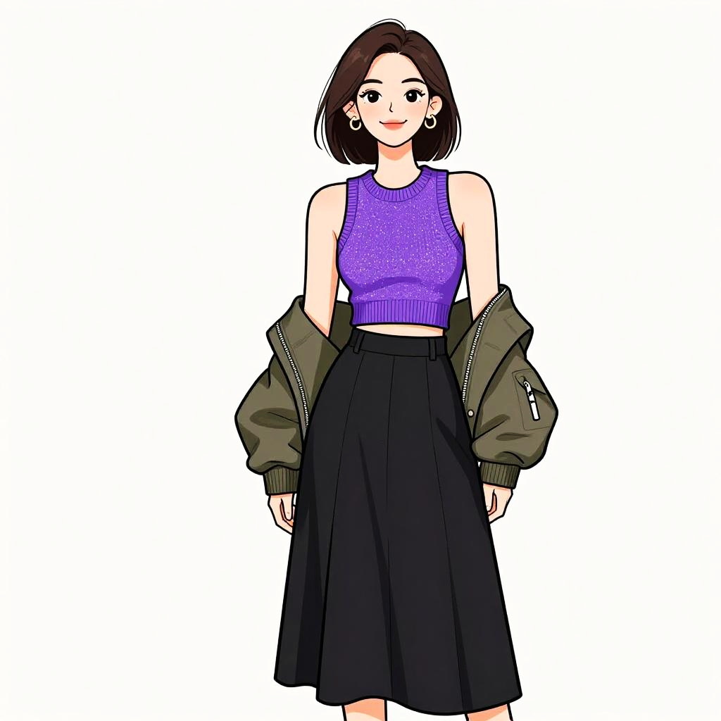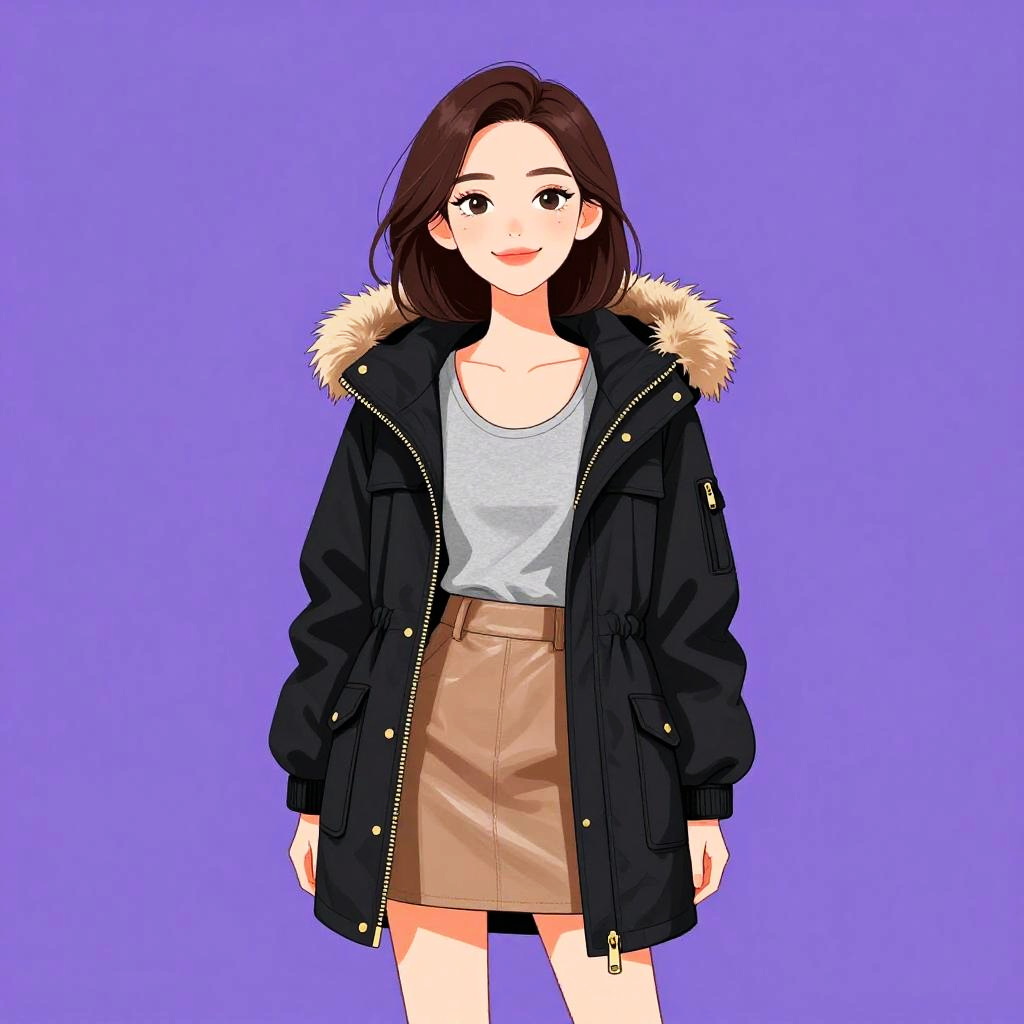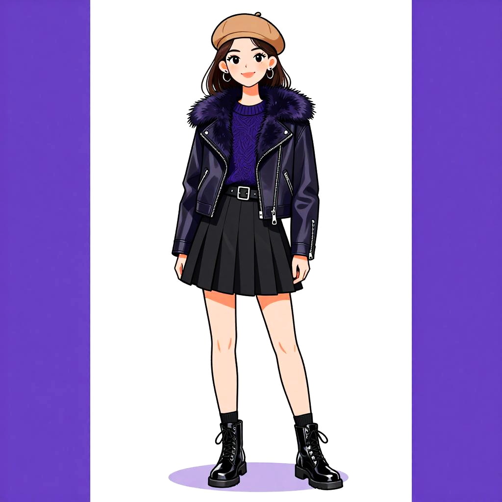 Woman with pretty face and pretty hair. smiling Woman, urban casual, black pleated mini skirt, dark navy textured sweater, leather biker jacket with oversized fur collar, cinched waist with buckled belt, black ankle socks, glossy black patent leather lace-up boots, tan beret, white studio background --sref 1467