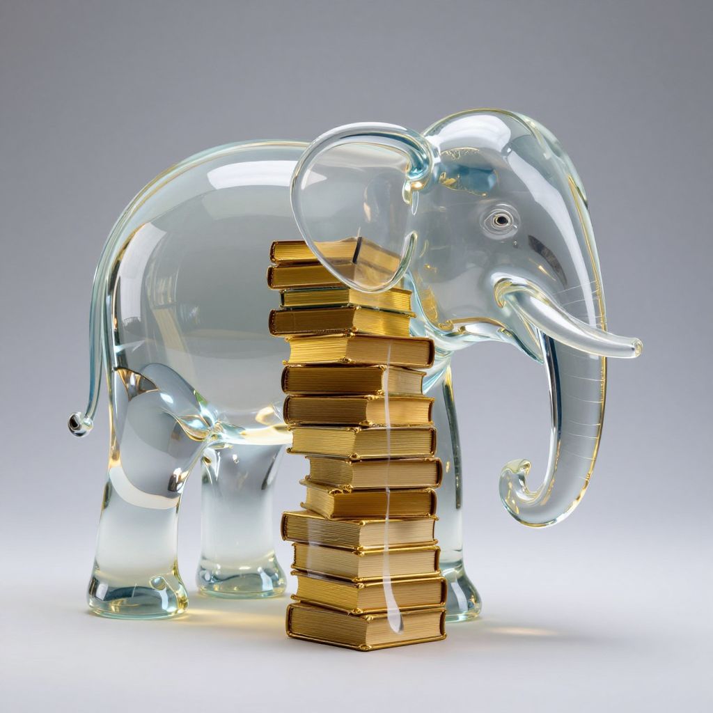 Glass elephant sculpture stands elegantly, its translucent body encasing a stack of golden-yellow books, creating an illusion of consuming knowledge while reflecting light and surroundings.