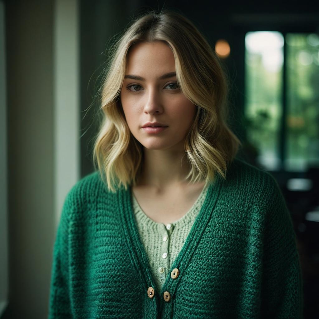 A portrait of a young woman with medium-length blond hair and natural makeup, wearing a green knitted cardigan, standing in an indoor setting with soft moody lighting and deep shadows, realistic photography style with cool and muted colors, soft focus and cinematic atmosphere