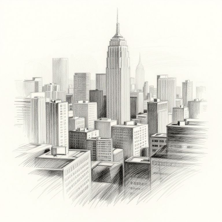 Photo to pencil sketch free application effect, a dynamic cityscape image rendered as a detailed pencil sketch, emphasizing architectural lines, depth through crosshatching, subtle smudging, and a natural sketchbook vibe