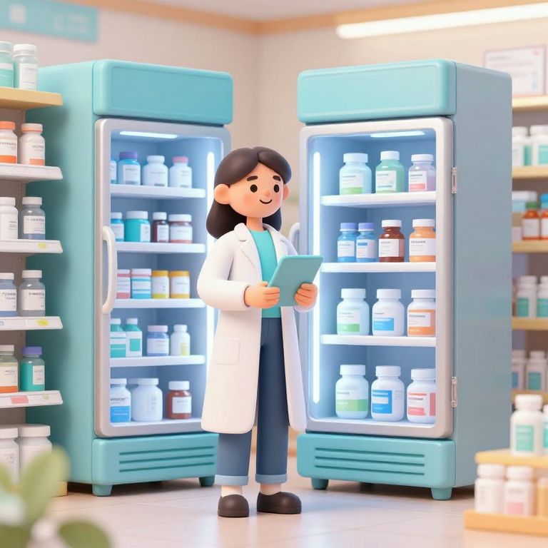 A digital illustration depicts a smiling woman with medium-length black hair, wearing a white lab coat over a blue top and dark blue pants, standing in a brightly lit pharmacy. She holds a green tablet and stands between two open, illuminated blue refrigerators filled with variously colored medication bottles. The background includes blurred shelves with more medication. The woman's large, black eyes and simple, cartoon-like features give her a friendly, approachable appearance. The scene is colorful and clean, emphasizing the organized and sanitary environment of the pharmacy.