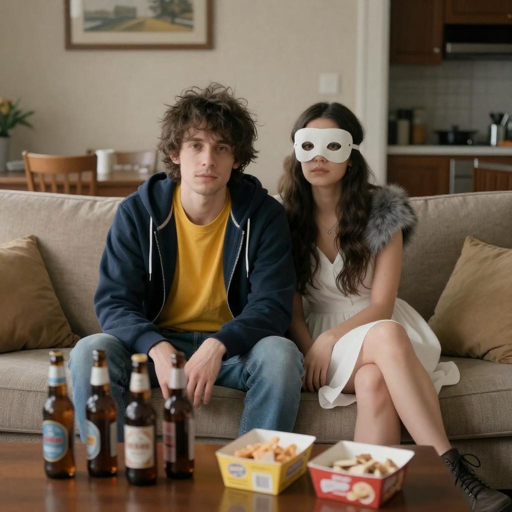 Man with messy dark hair, yellow shirt, and navy hoodie sits on a couch. Beside him, a woman in a white dress and mask with gray fur, legs exposed. Six beer bottles and snack boxes on the coffee table. Living room background with patterned wallpaper, table, chairs, and kitchen. Woman leans into man, both looking forward.