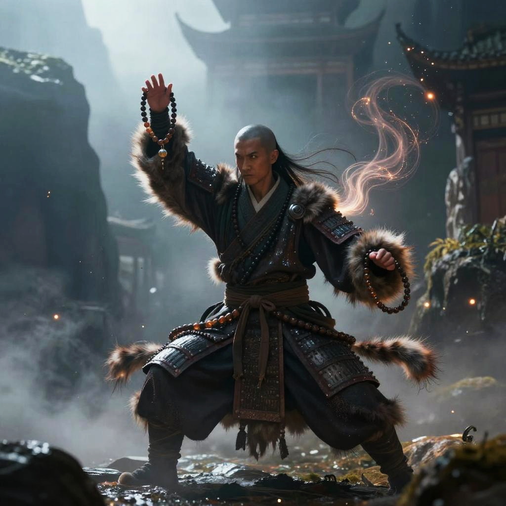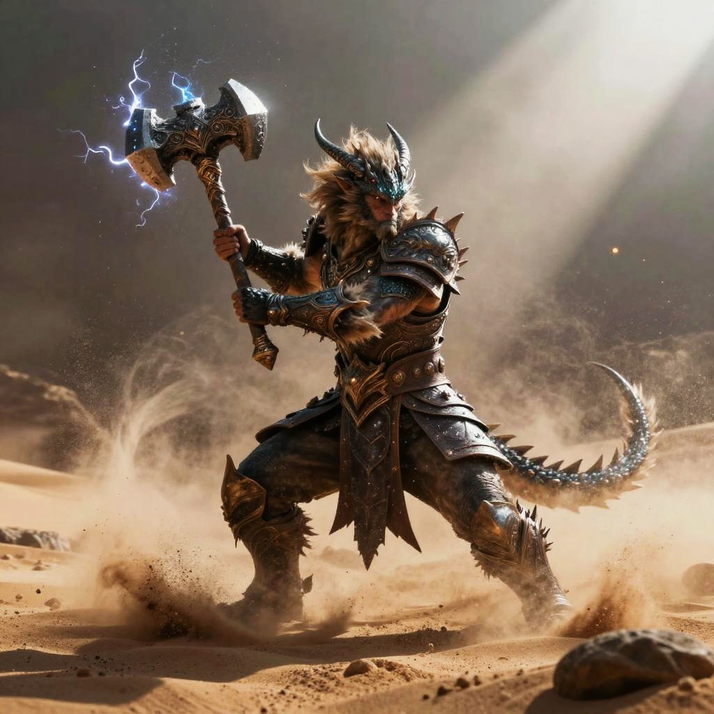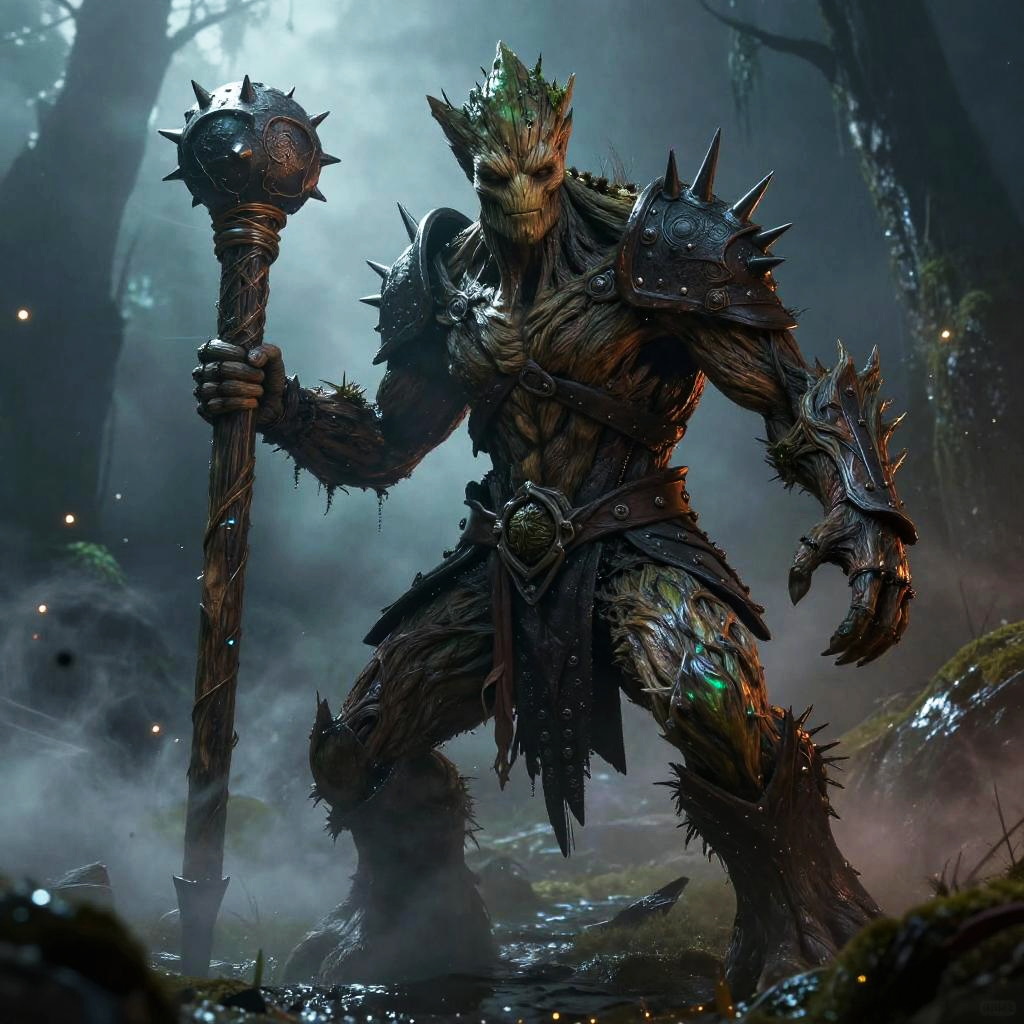 Gnarled treant guardian on twilight-tinged misty swamp, wielding iron-spiked wooden club; epic fantasy scene with swirling mist, glowing accents, sparks and tracer smoke; dramatic three-quarter view, powerful stance, cinematic lighting, volumetric rays and rim light; rich jewel-toned palette, ultra-detailed fur and armor, wet surfaces and reflections; atmospheric perspective, high contrast, sharp focus, depth of field, rule of thirds framing; particles and embers, storytelling environment, mythic scale, SDXL masterpiece