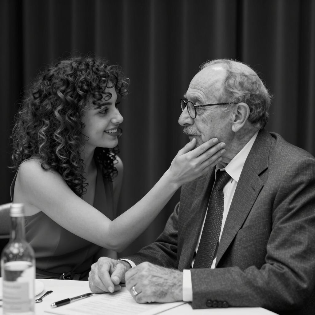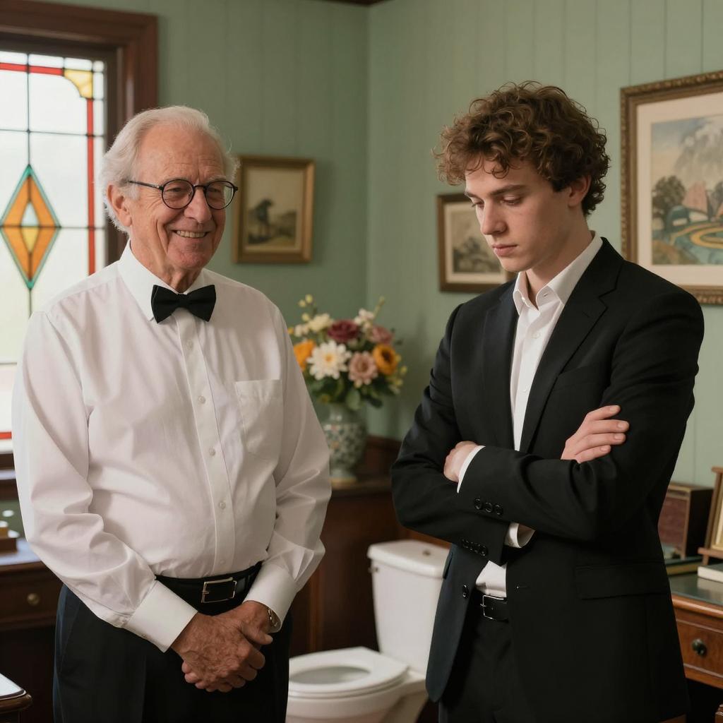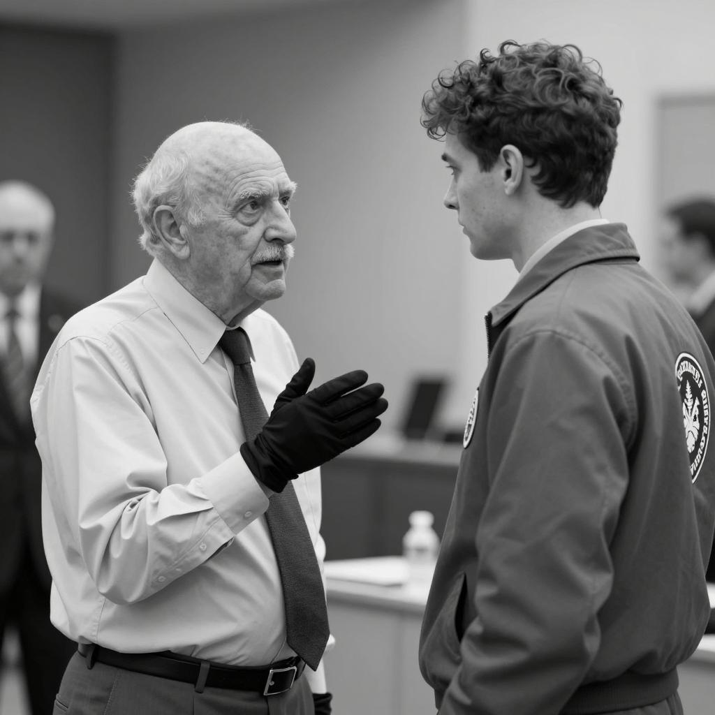 Black and white photograph of two men. Older man with bald head, mustache, light shirt, dark tie, and dark gloves gestures with his right hand. Younger man with curly hair, light shirt, and dark jacket with emblem on back stands facing him. Both look at each other. Background is blurred with indistinct shapes and objects.