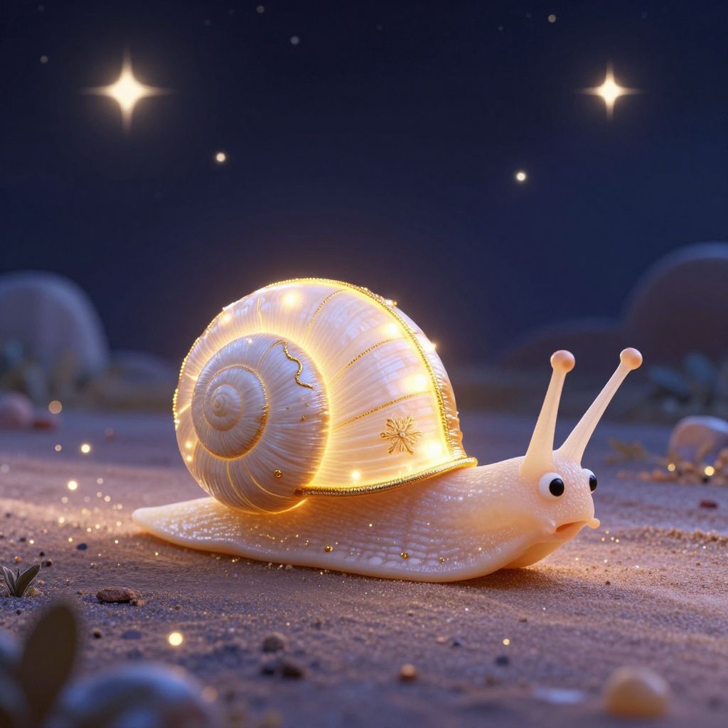 A whimsical 3D-rendered snail with a glowing spiral shell and golden accents races through a dreamlike, starlit night, embodying the fusion of fantasy and digital artistry as it traverses a path of scattered sand and light, evoking the enchanting narrative of children born from shadow and song.