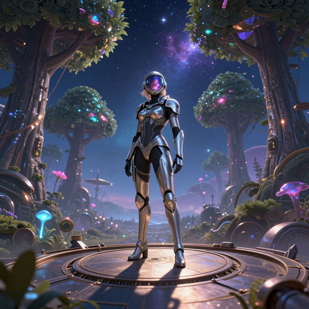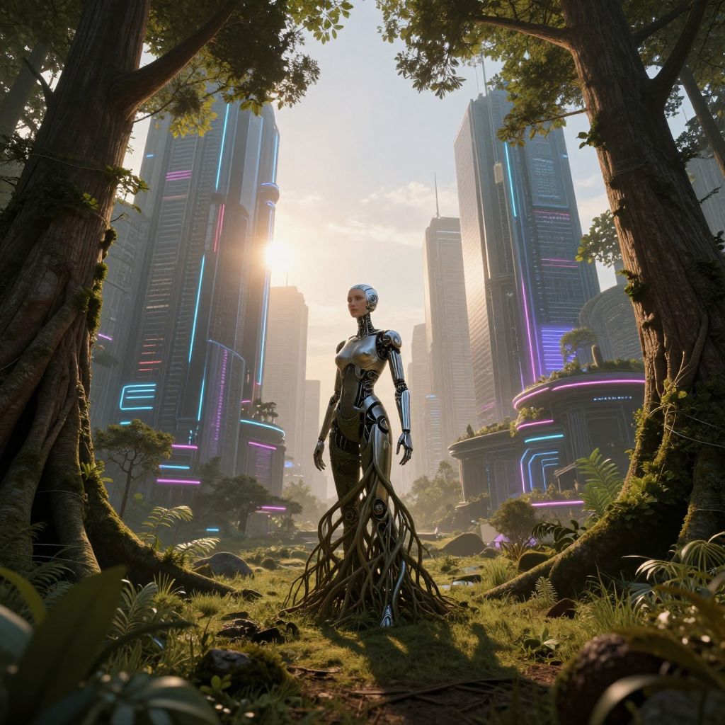 In an extraordinary fusion of nature and machinery, behold a breathtaking panorama from an elevated vantage point. Graceful metallic trees sway in the wind against a setting sun, their luminous fruits glowing with otherworldly radiance. The ground below is scattered with relics of an ancient civilization, reclaimed by verdant vines and exotic flowers in rich hues of purple and gold. In this enigmatic landscape where organic and mechanical realms blur, a solitary figure emerges—a part-human, part-machine entity wearing an exquisitely crafted suit of living metal armor that pulses with its own energy. With fluid movements, it navigates this realm, embodying the symbiotic relationship between nature and technology in a scene evoking wonder, unease, and awe.
