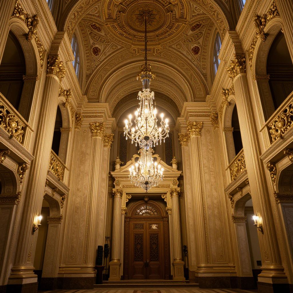 Photograph of an opulent, ornately decorated church interior. The focus is on a grand, crystal chandelier hanging from a richly patterned, gold-embellished ceiling. The walls are adorned with tall, fluted columns and intricate, gold-accented arches. A large, wooden double door with carved designs is centered at the far end. The warm, golden light from the chandelier and wall sconces highlights the elaborate details, creating a lavish, almost regal atmosphere. The image captures the grandeur and intricate craftsmanship of the architectural design.