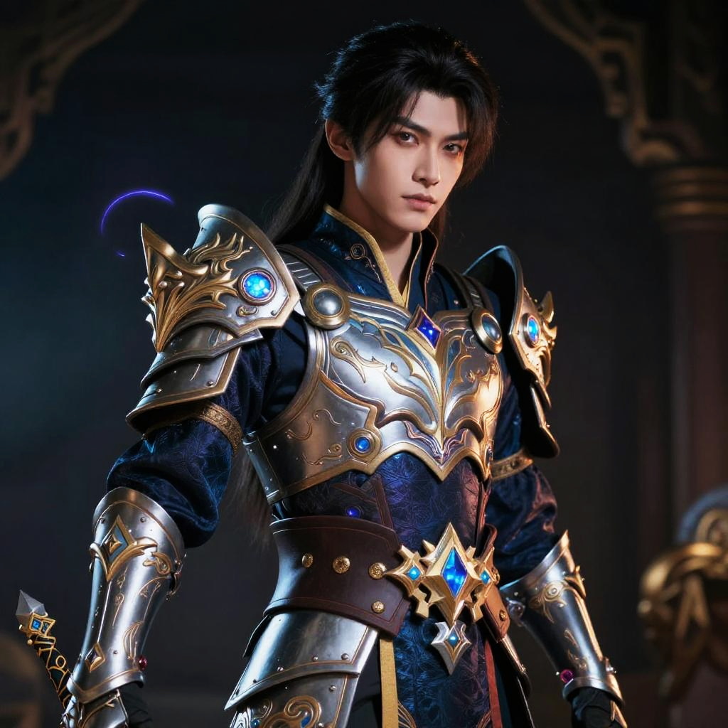 Ninja with flowing blue hair blending into swirling mist, ancient temple background, intricate armor details, mystic glowing runes around, fantasy art style