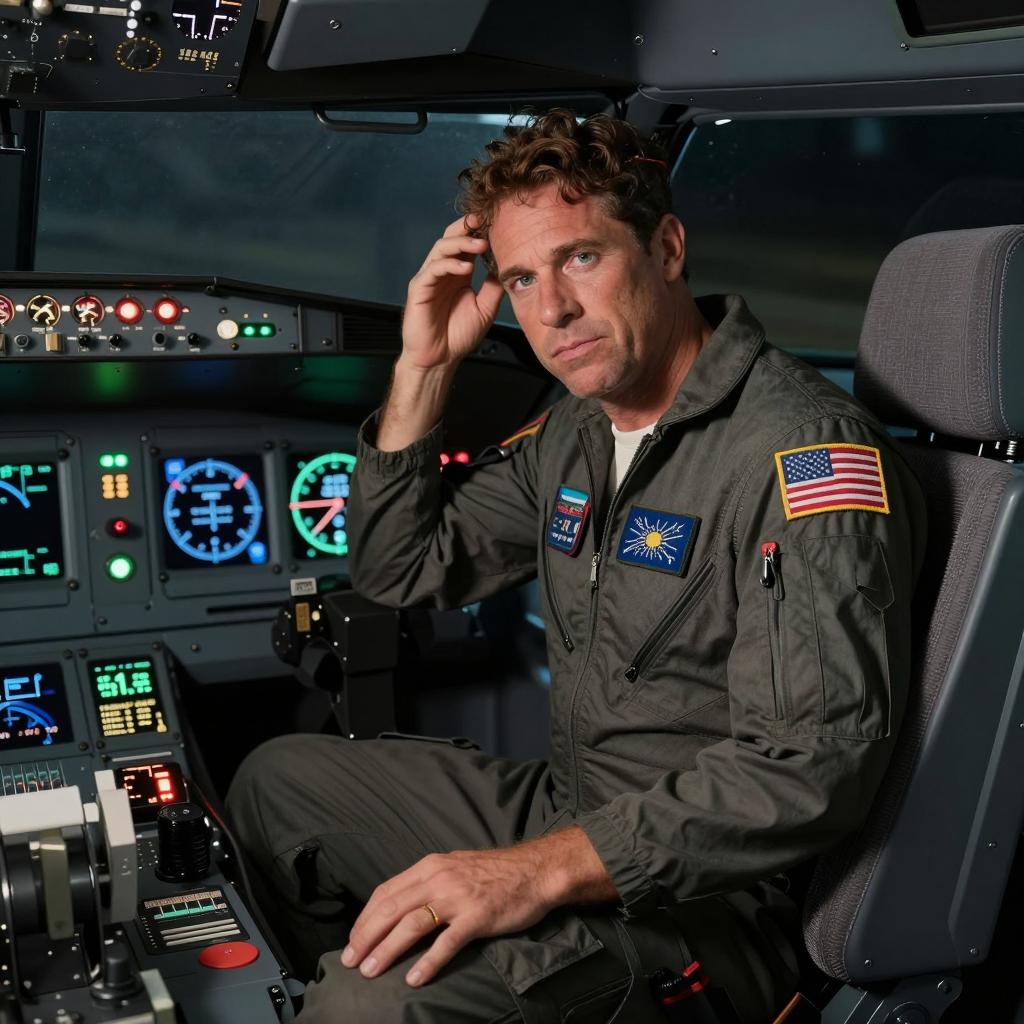 A man with curly brown hair sits in a dark cockpit, wearing a brown flight suit with an American flag patch on the sleeve. His right hand rests on his head, and his left hand is on his knee. Multiple digital and analog displays are in front of him. Red and green lights are visible on the left. The background includes cockpit instruments and a dimly lit area. He has a focused expression.