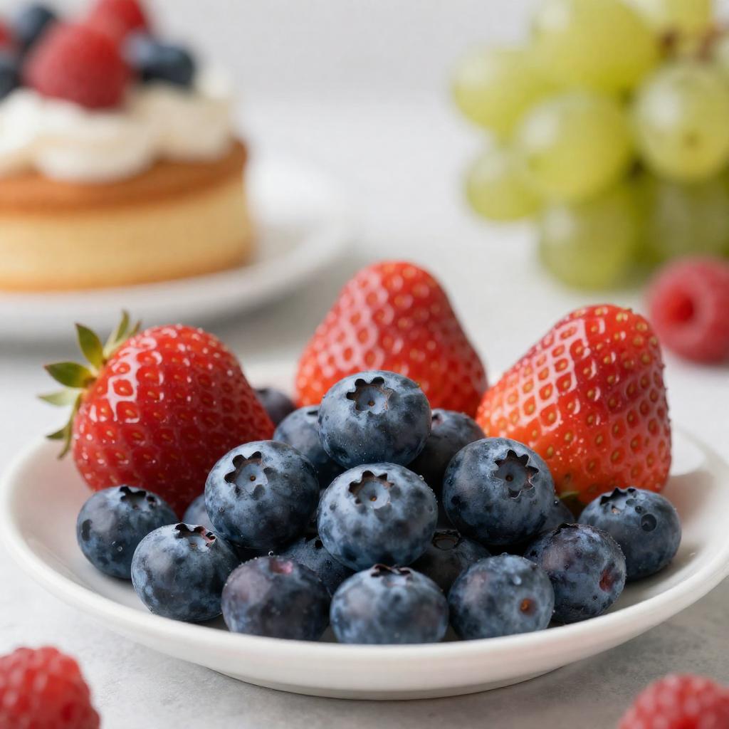 Food, fruit, no humans, blueberry, food focus, strawberry, blurry, still life, raspberry, cake, leaf, blurry background, plate, realistic, berry, dessert, depth of field, pastry, table, grapes