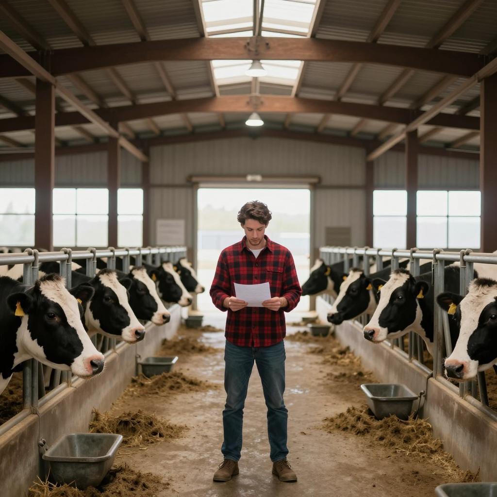 Indoor dairy barn with a man standing in the center, wearing a red plaid shirt and jeans, holding a paper. Multiple black and white cows stand in metal stalls to the left and right. Bright light streams through large windows in the background. Metal railings and water troughs are visible. Ceiling has exposed wooden beams and industrial lighting.