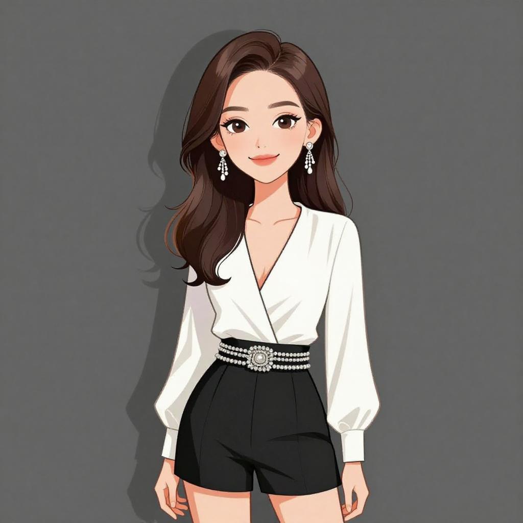 Woman with pretty face and pretty hair. smiling Woman, evening wear, white long-sleeve blouse with deep V-neckline, black tailored shorts, embellished waistband with silver accents, chandelier earrings. --sref 1467