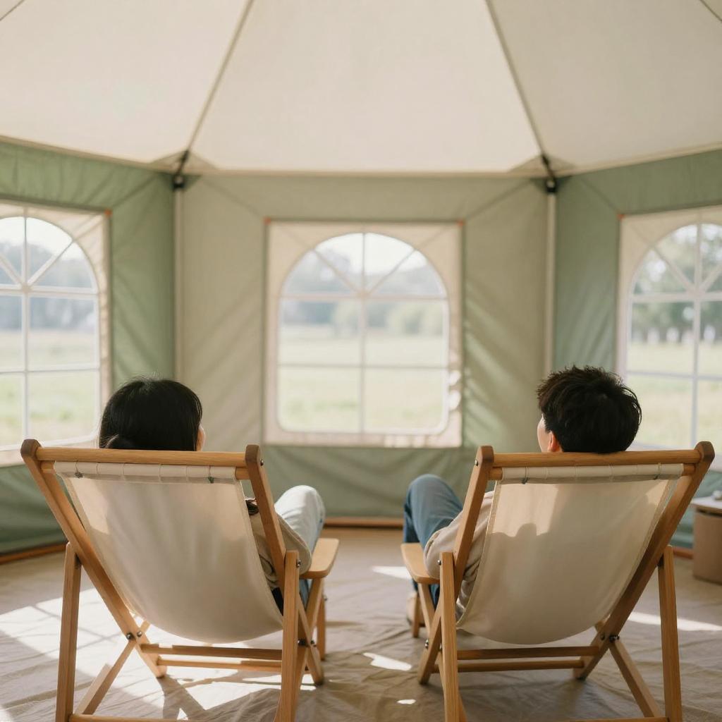 Photograph of a cozy, sunlit tent interior taken from a slightly elevated angle. Two people are lounging on wooden deck chairs, backs to the camera, with their heads resting on cushions. The tent has green fabric walls and a white canopy, with sunlight streaming through the arched windows. The background is softly blurred, creating a shallow depth of field. The lighting is natural and warm, casting gentle shadows.