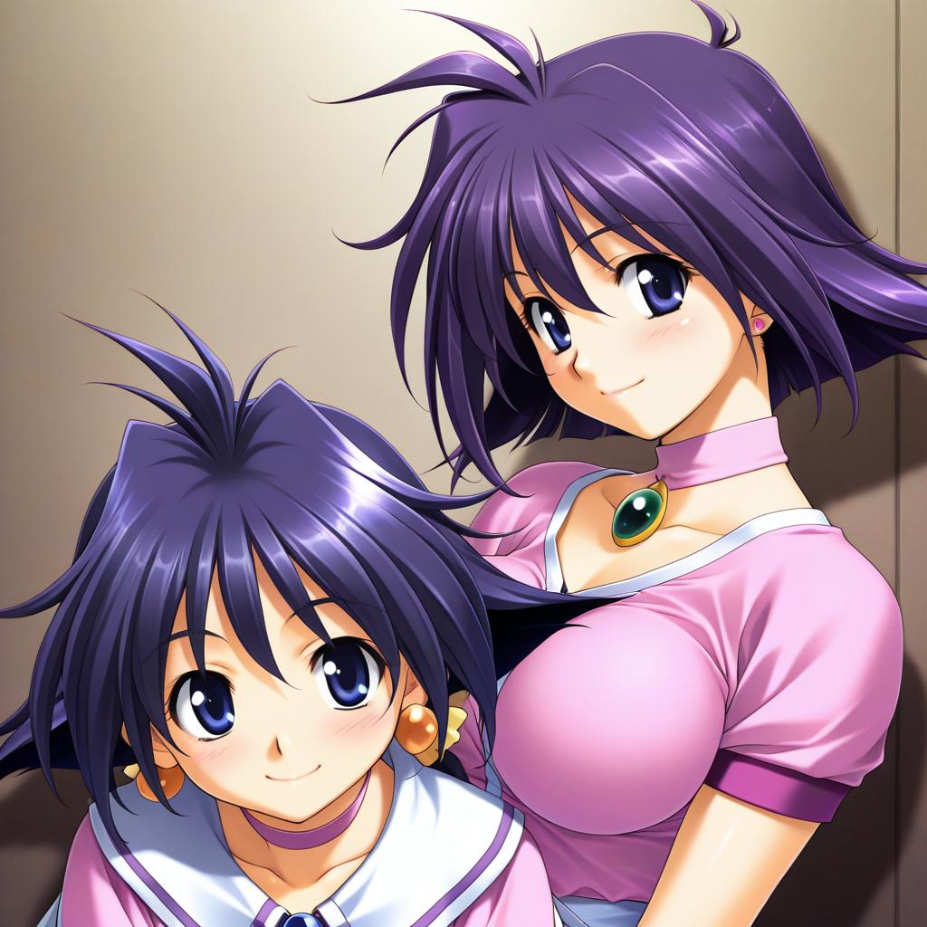 Digital illustration of two anime characters resembling Amelia Wil Tesla Seyruun from Slayers. Both have purple hair and blue eyes. One character wears a pink top with a light pink choker and a green pendant, showcasing medium to large breasts. The other character wears a white and blue sailor-style school uniform with a purple choker and golden earrings. The style is vibrant and detailed, inspired by the artist Hashimoto Takashi.