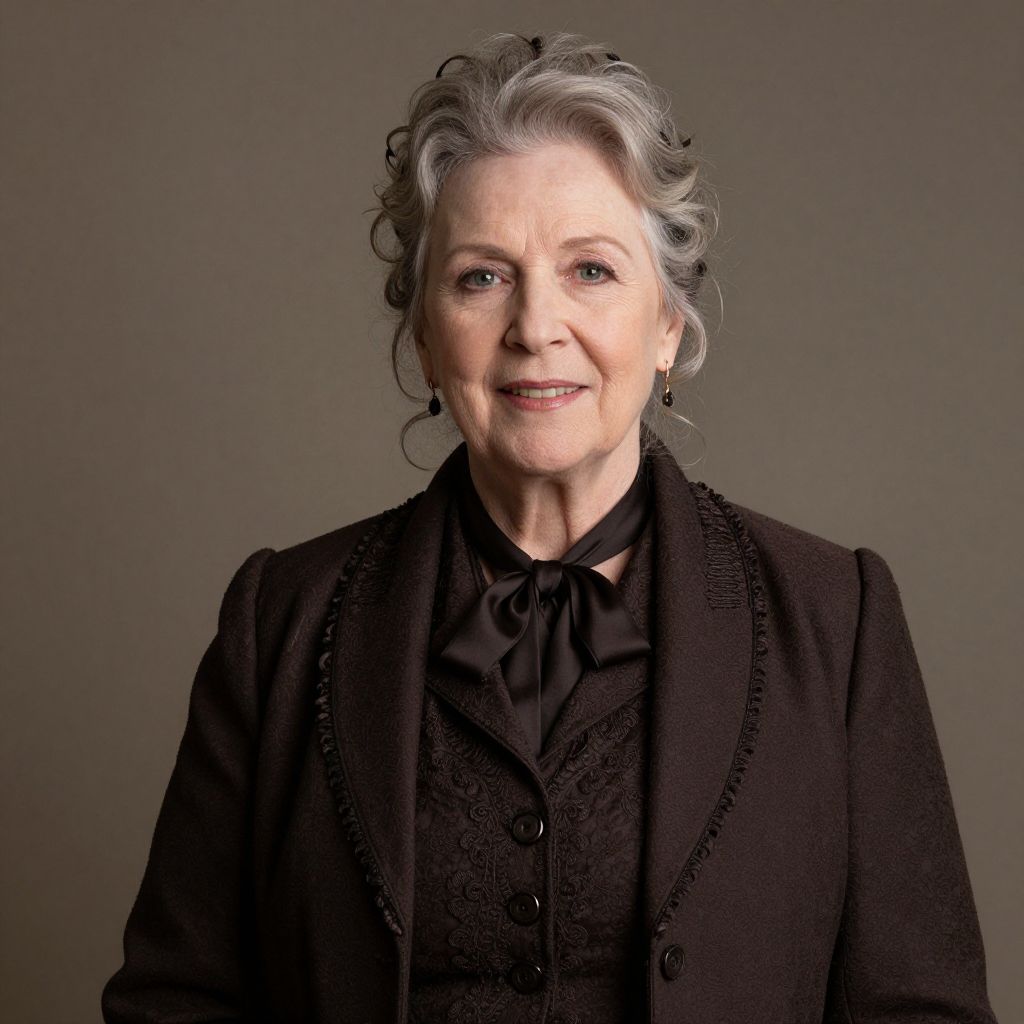 Mockup a half portrait of a rich elderly Victorian woman wearing wealthy dark brown clothing, smirking,