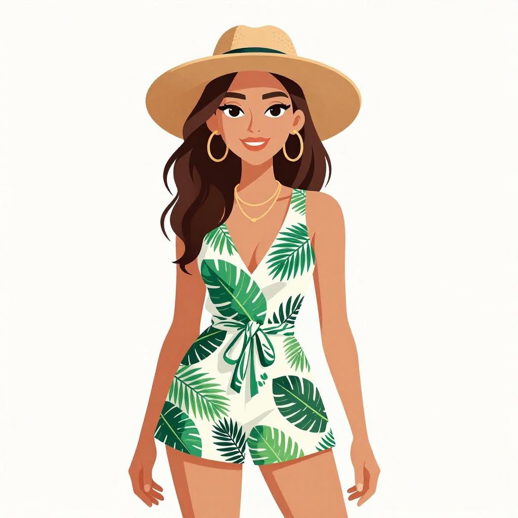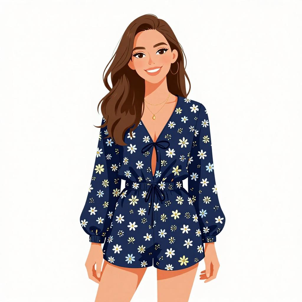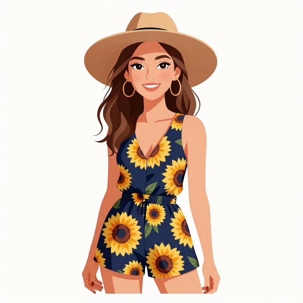 Woman with pretty face and pretty hair. smiling Woman, bohemian chic, navy blue romper with vibrant sunflower print, sleeveless, ruched waist, short-length, wide-brimmed tan felt hat, white background --sref 1467