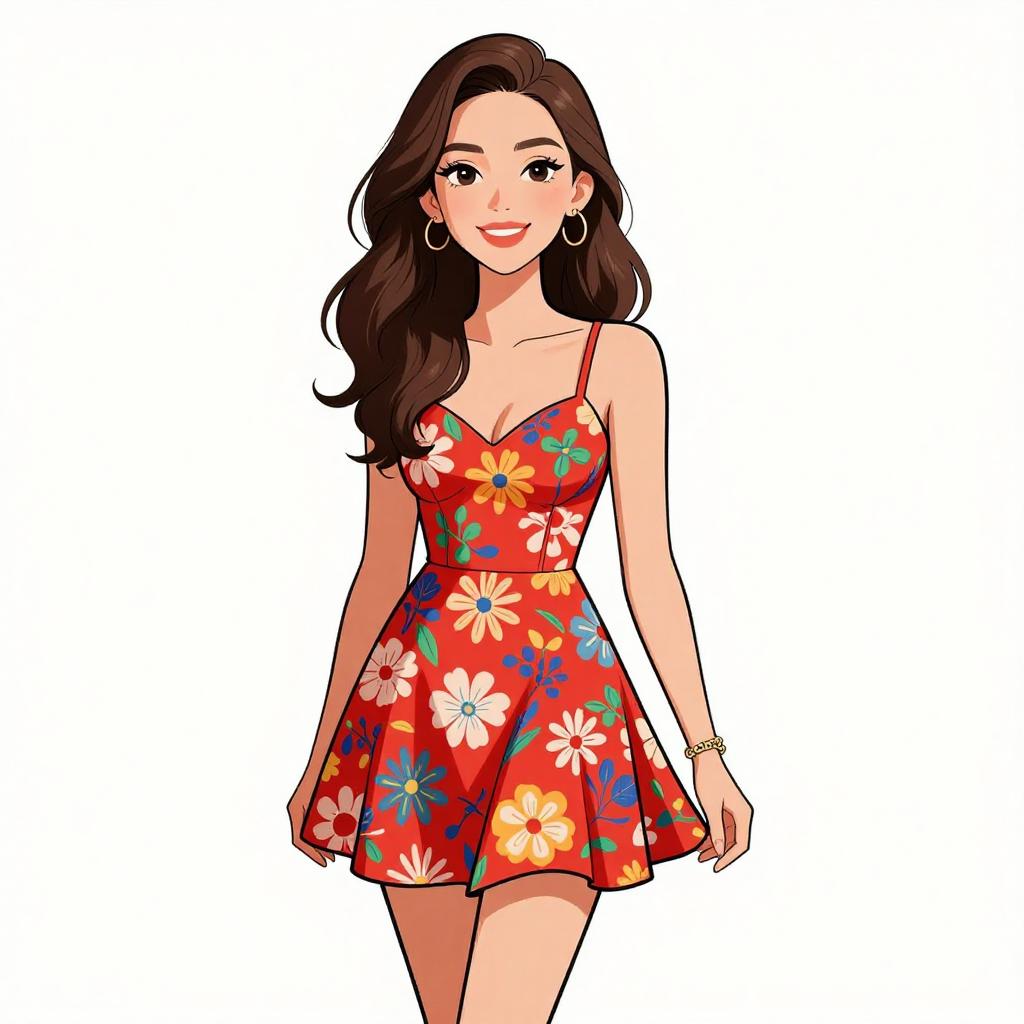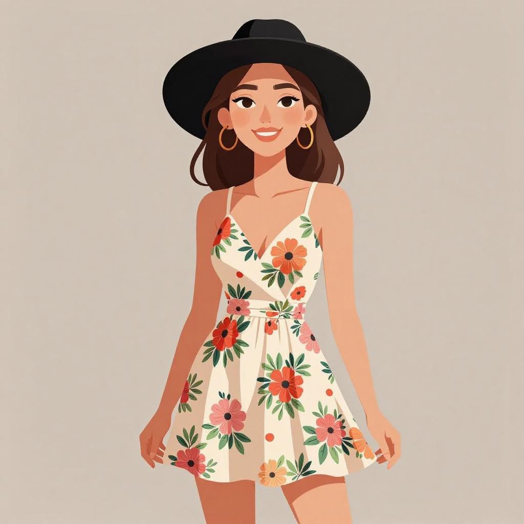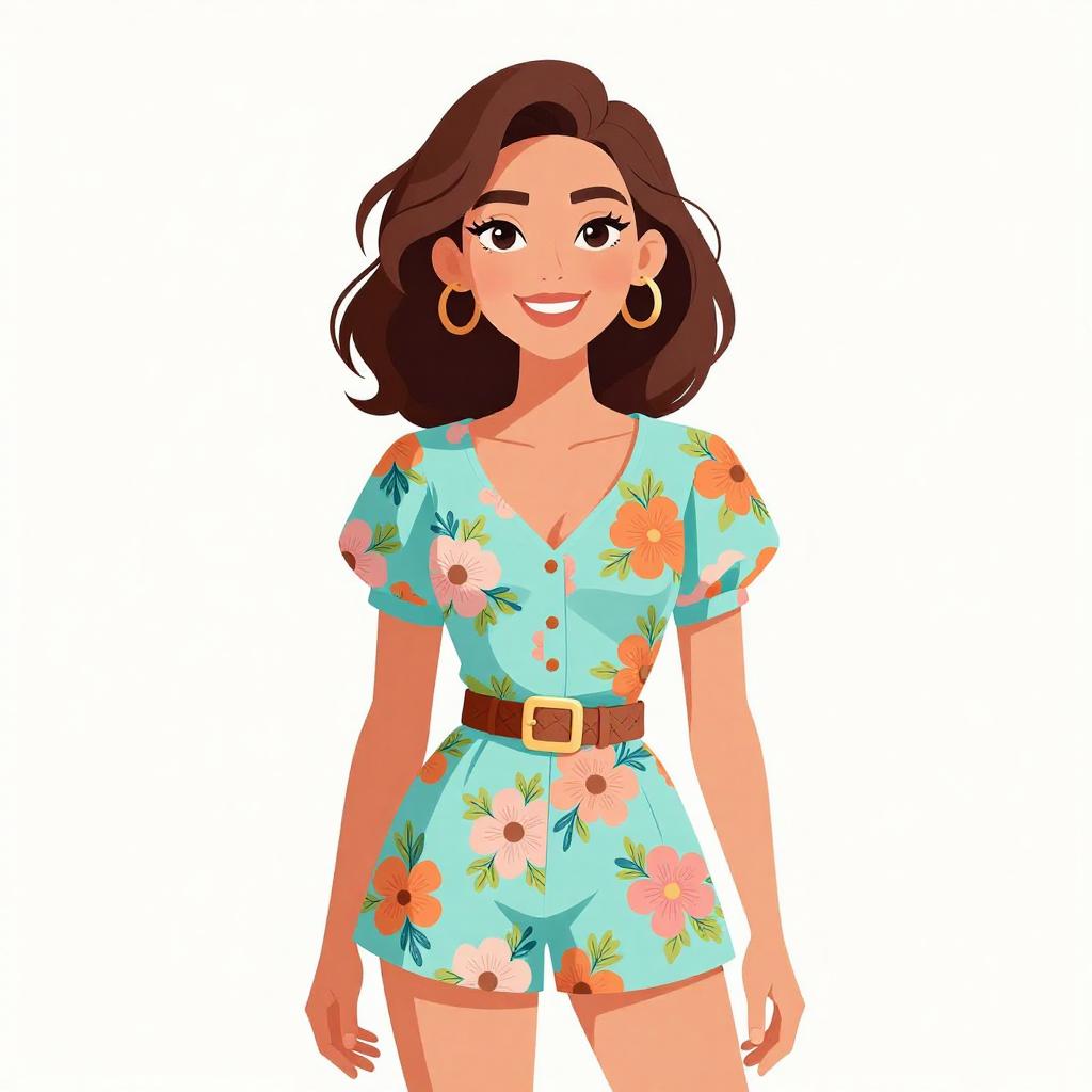 Woman with pretty face and pretty hair. smiling Woman, bohemian chic, navy blue romper with vibrant sunflower print, sleeveless, ruched waist, short-length, wide-brimmed tan felt hat, white background --sref 1467