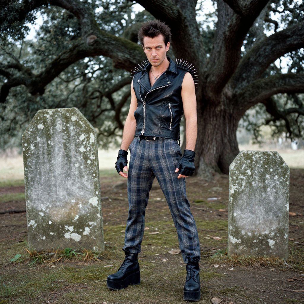 A man, edgy look, spiked black faux leather vest, blue and grey plaid pants, chunky platform boots, fingerless gloves, ancient oak trees, weathered stone markers, soft moss underfoot, anscochrome analog film, confident expression. Man has masculine face and piercing eyes