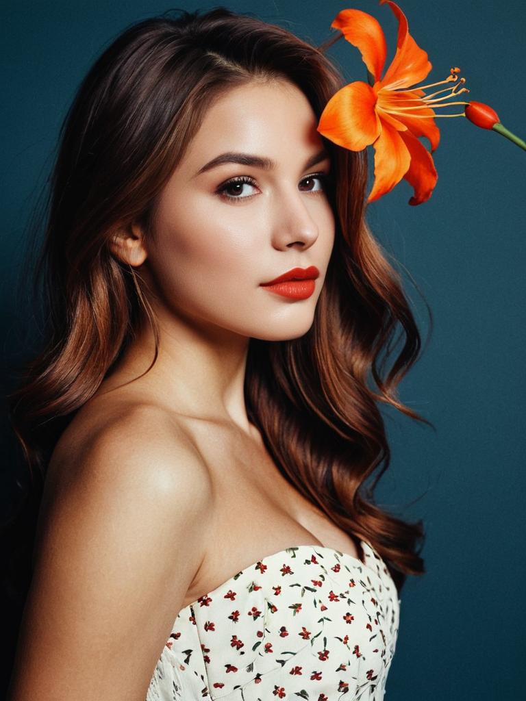 Close-up portrait of a young woman with long brown hair and brown eyes, wearing strapless navy blue polka dot dress. She has red lipstick and subtle makeup with blush. An orange flower is positioned near her lips as she looks slightly to the side against a plain gray background.