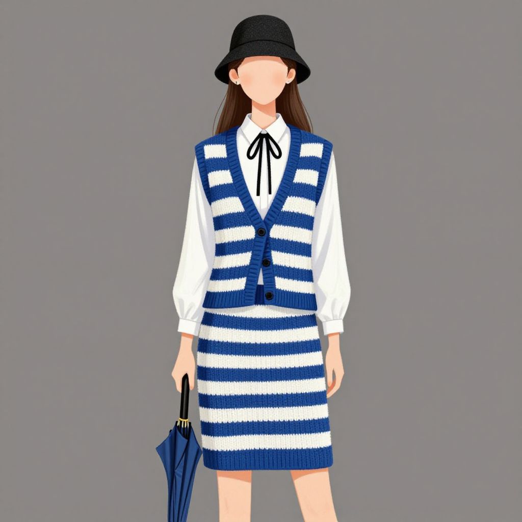 Fashion illustration of woman in knitted outfit with hat and umbrella, wearing a striped blue and wite sleeveless cardigan over a white blouse and matching skirt with black bow tie.