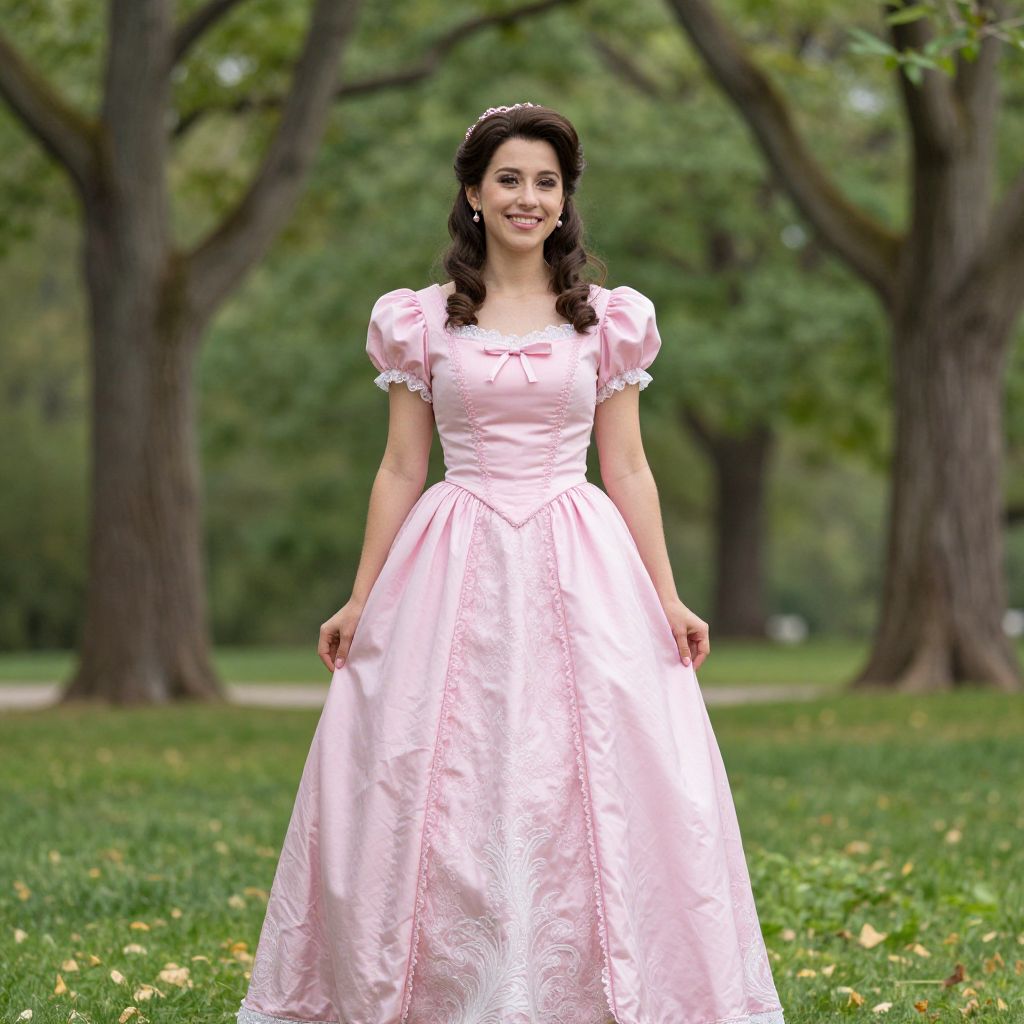 Photograph of a young woman standing in a lush, green park with tall trees in the background. She has dark brown, wavy hair styled in an updo with a small, white flower hairpin. She is wearing a full, pastel pink, Victorian-style ball gown with puffed sleeves and intricate white embroidery on the skirt. Her fair skin contrasts with the dress. She is smiling warmly and looking directly at the camera. The grass is vibrant green, and scattered yellow leaves are visible on the ground, adding a touch of autumn to the scene. The background is softly blurred, emphasizing her as the focal point.
