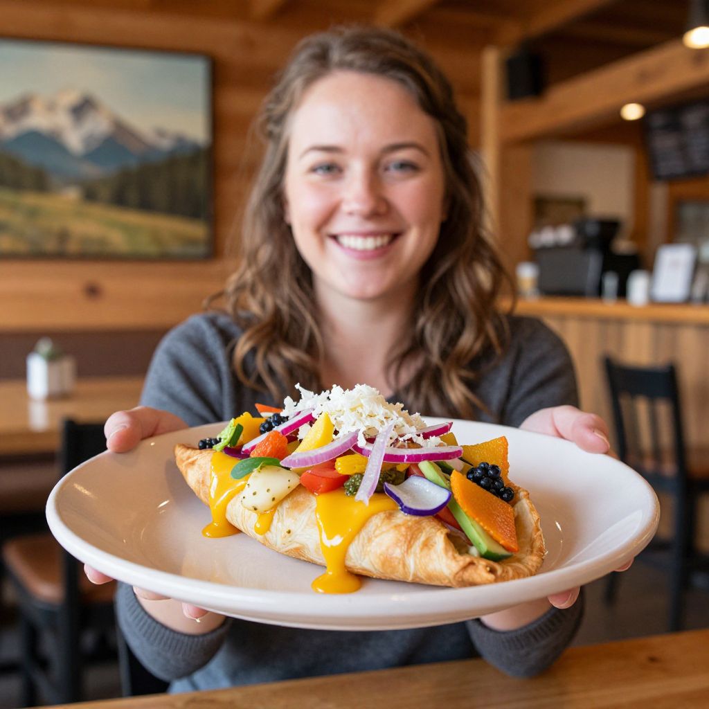 Smiling woman at Mountain Mama Cafe in West Yellowstone holds a freshly baked turnover filled with colorful ingredients, showcasing a vibrant meal in a cozy wooden interior.