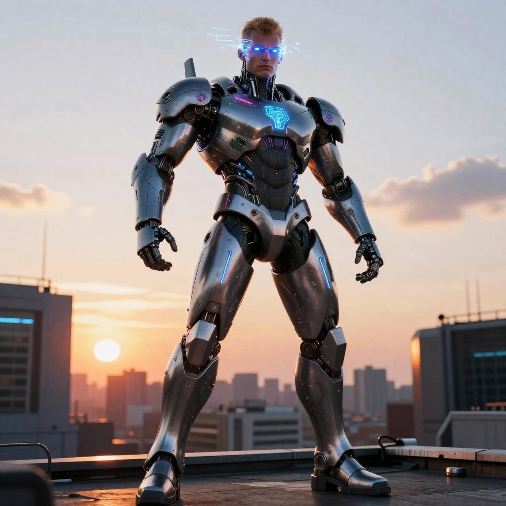 CGI image of a muscular, silver robotic man with glowing blue eyes standing on a rooftop at sunset, city skyline in background.