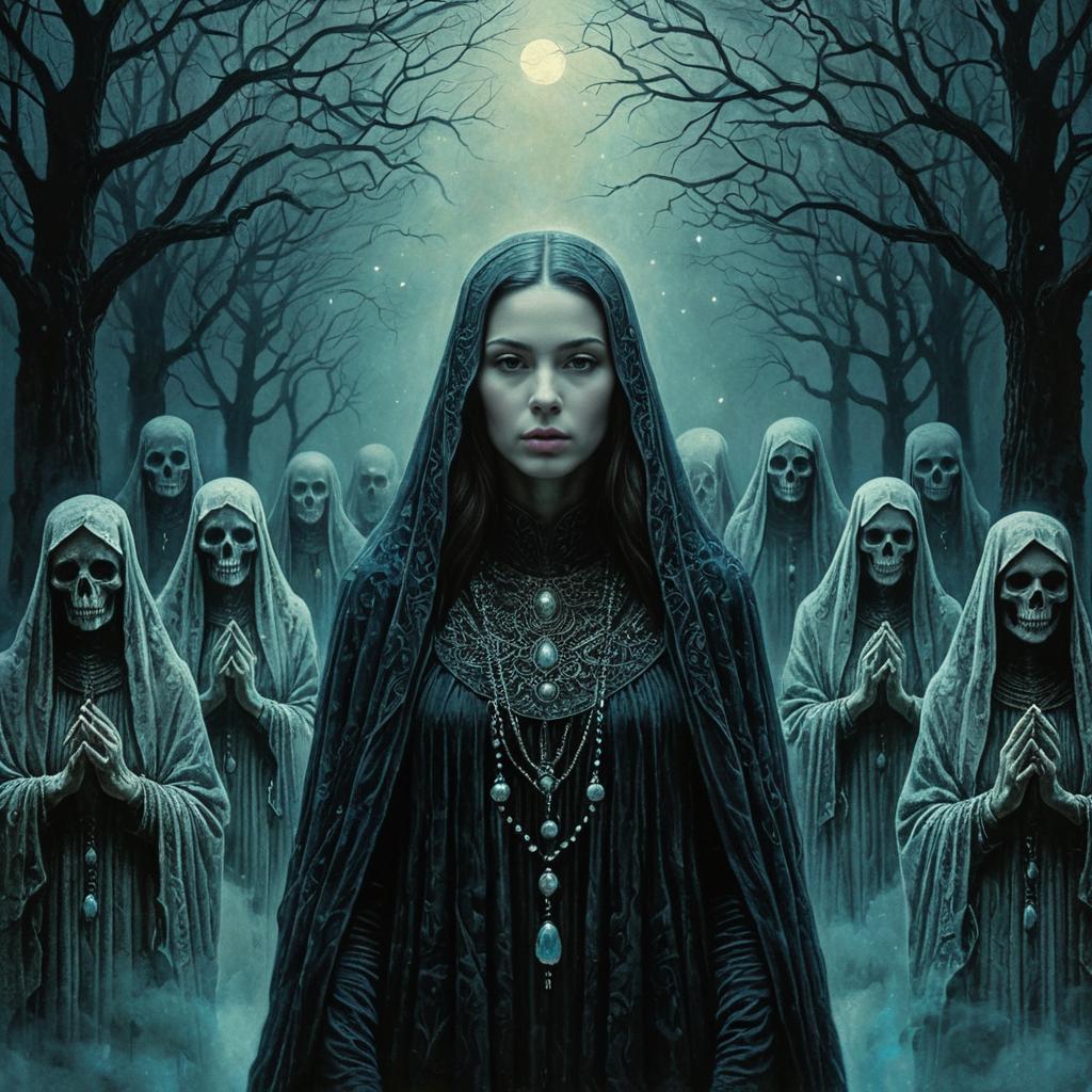 Portrait of a night girl surrounded by phantasmagoric night animals, inspired by Zdzislaw Beksinski, with deep twilight tones, extremely detailed, intricate, beautiful, high definition, surreal atmosphere