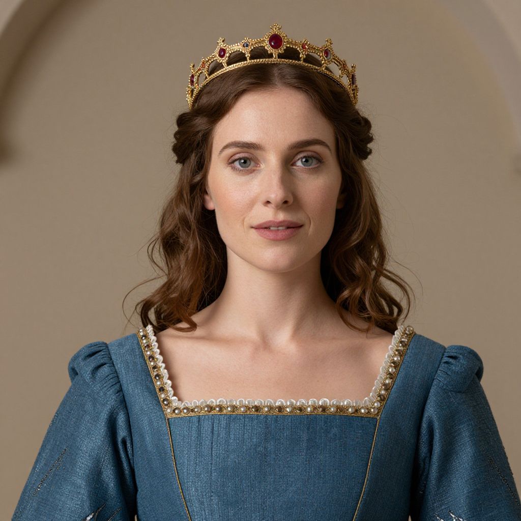 Photograph of a fair-skinned woman with wavy brown hair, wearing a gold crown adorned with red gems and intricate gold patterns. She has blue eyes and a slight smile. She is dressed in a rich blue, medieval-style gown with puffed sleeves and a square neckline trimmed with gold beads. The background is a plain, beige wall with a soft arch visible on the left. The lighting is even, highlighting her serene expression and elegant attire.