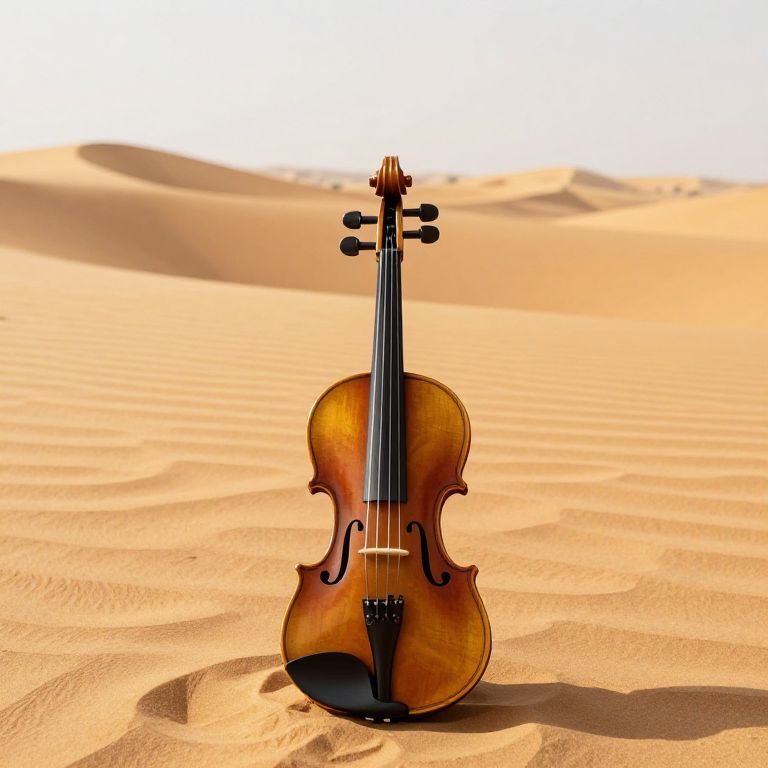 Photograph of a brown, wooden violin with a glossy finish, standing upright in the center of a vast, sandy desert. The violin's strings and pegs are visible, and its body casts a shadow on the smooth, undulating sand. The background features soft, rolling sand dunes under a bright, white sky, creating a stark contrast with the violin's rich, warm tones. The sand's texture is fine and smooth, with gentle ripples and shadows adding depth to the scene. The violin is the sole object, emphasizing its elegance and isolation in the expansive, desert landscape.