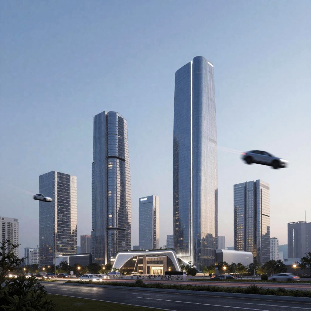 Photograph of a modern cityscape at dusk featuring several tall, glass skyscrapers with sleek, reflective surfaces. The tallest building is centrally located, flanked by slightly shorter towers. A unique, white, bridge-like structure with illuminated windows is prominent in the mid-ground. The sky is clear with a gradient from light blue to dark. A blurred, motion-tracked object, possibly a drone, is seen in the foreground to the right. Streetlights and scattered traffic lights cast a soft glow, and a road with faint car lights runs horizontally at the bottom. Sparse trees are visible at the edges.