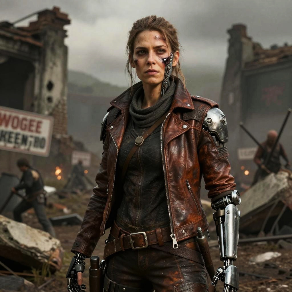 Exposure Bracketing sci-fi grimdark setting, scarred female scavenger with burnt cheek with metallic implants and prosthetic biomechanical arm, wearing a patched brown leather jacket, standing with a stoic expression with ruins and signs of warfare behind her