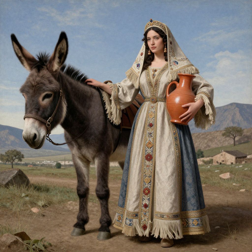 A woman in a traditional, fringed dress and headpiece stands next to a donkey, holding a clay vase, with intricate details and a whimsical, Caravaggio-inspired style.