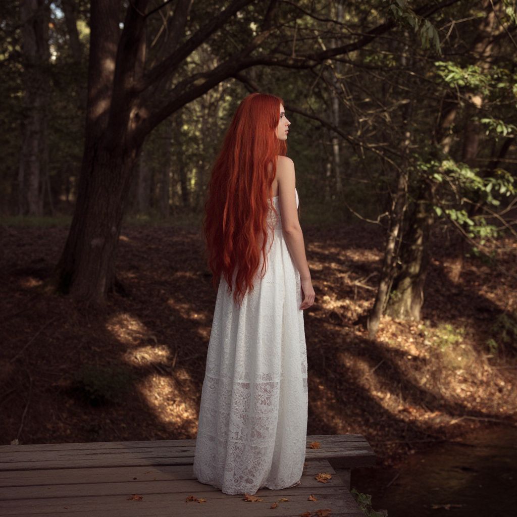An ethereal woman with cascading red hair stands at the edge of a rustic wooden bridge, her form translucent and merging seamlessly with the serene forest setting. Adorned in a white lace dress that drifts like autumn leaves, she gazes into the distance, evoking a sense of mystery and longing. The interplay of vibrant red hues against the earthy tones of the forest floor creates a captivating visual symphony, resonating with both beauty and melancholy as sunlight filters through dense trees, casting dappled shadows on the ground.