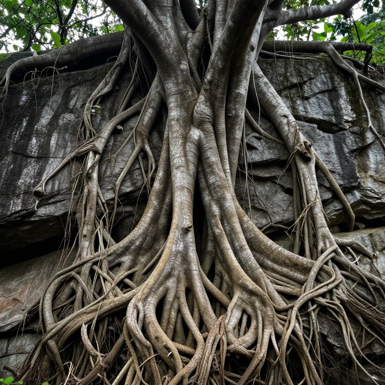 Trees sprout from the backs of slumbering giants, their roots entwined within earthen veins of rock, pulsing with the slow heartbeat of the world’s oldest dreams.