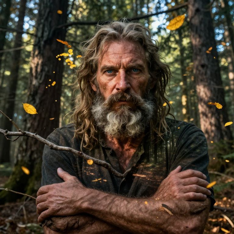 A captivating double exposure portrait captures a weathered individual with a grizzled beard and piercing blue eyes, exuding wisdom. Surrounded by an untamed forest, their silhouette merges seamlessly with towering trees, their gnarled branches intertwining with strong arms, narrating a story of survival amidst the wilderness. Golden leaves dance around them, symbolizing harmony between nature and humanity. Bathed in warm sunlight, elongated shadows accentuate the rugged terrain while drawing attention to their intense gaze, inviting viewers to share in this profound connection to the wild.