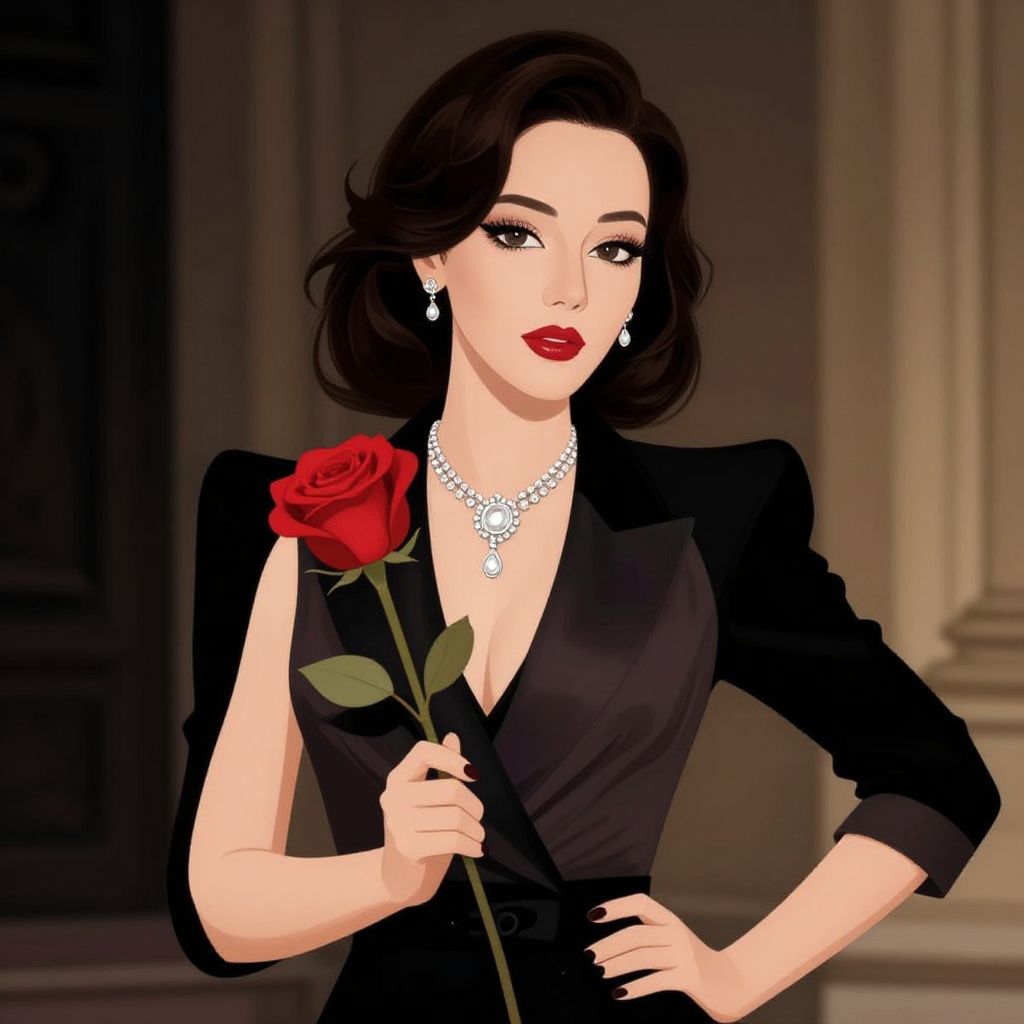 Digital illustration of a confident woman with black wavy hair, red lipstick, wearing a black dress and diamond necklace, holding a red rose in an elegant