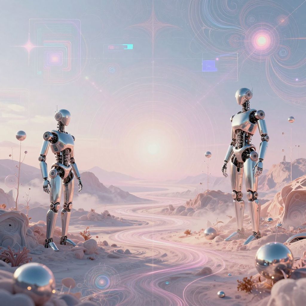 AI album covers portraying surreal landscapes merged with robotic elements, showcasing AI-generated humanoid figures intertwined with nature, ethereal color palettes of blues and purples, intricate geometric shapes, and a dreamlike atmosphere evoking mystery and innovation.