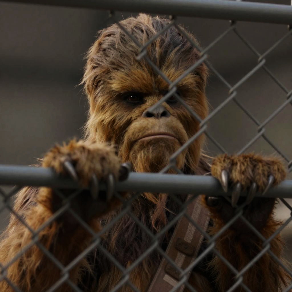 Photograph of a Wookiee character from Star Wars, gripping a chain-link fence with its right hand. The Wookiee has a serious expression, brown fur, and visible claws. The fence is in the foreground, partially obscuring the Wookiee's face. The background is out of focus. The Wookiee's left hand rests on the fence. The image captures a close-up of the Wookiee's face and hand.