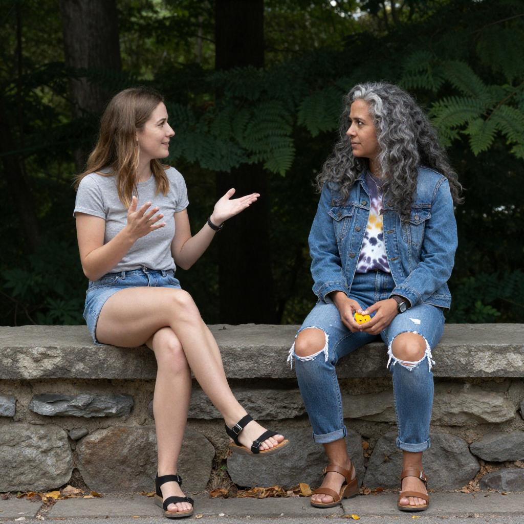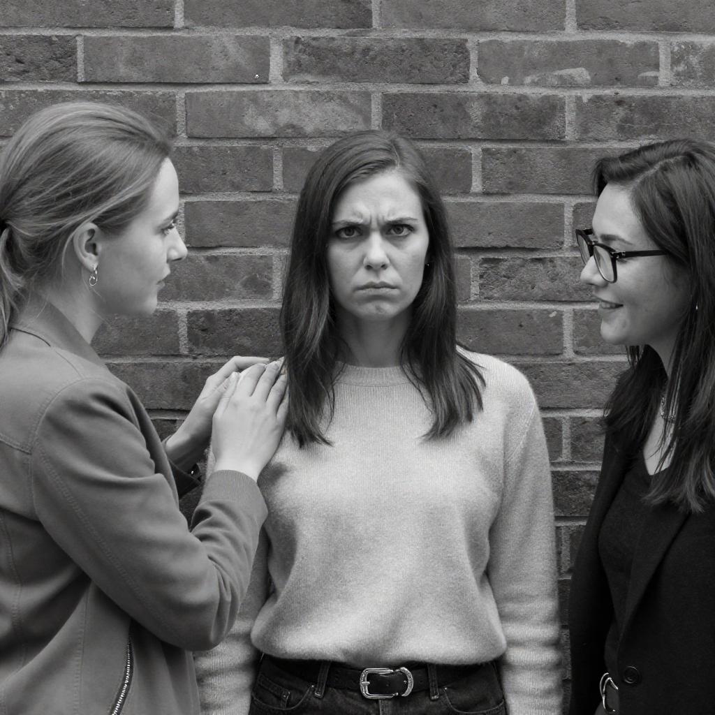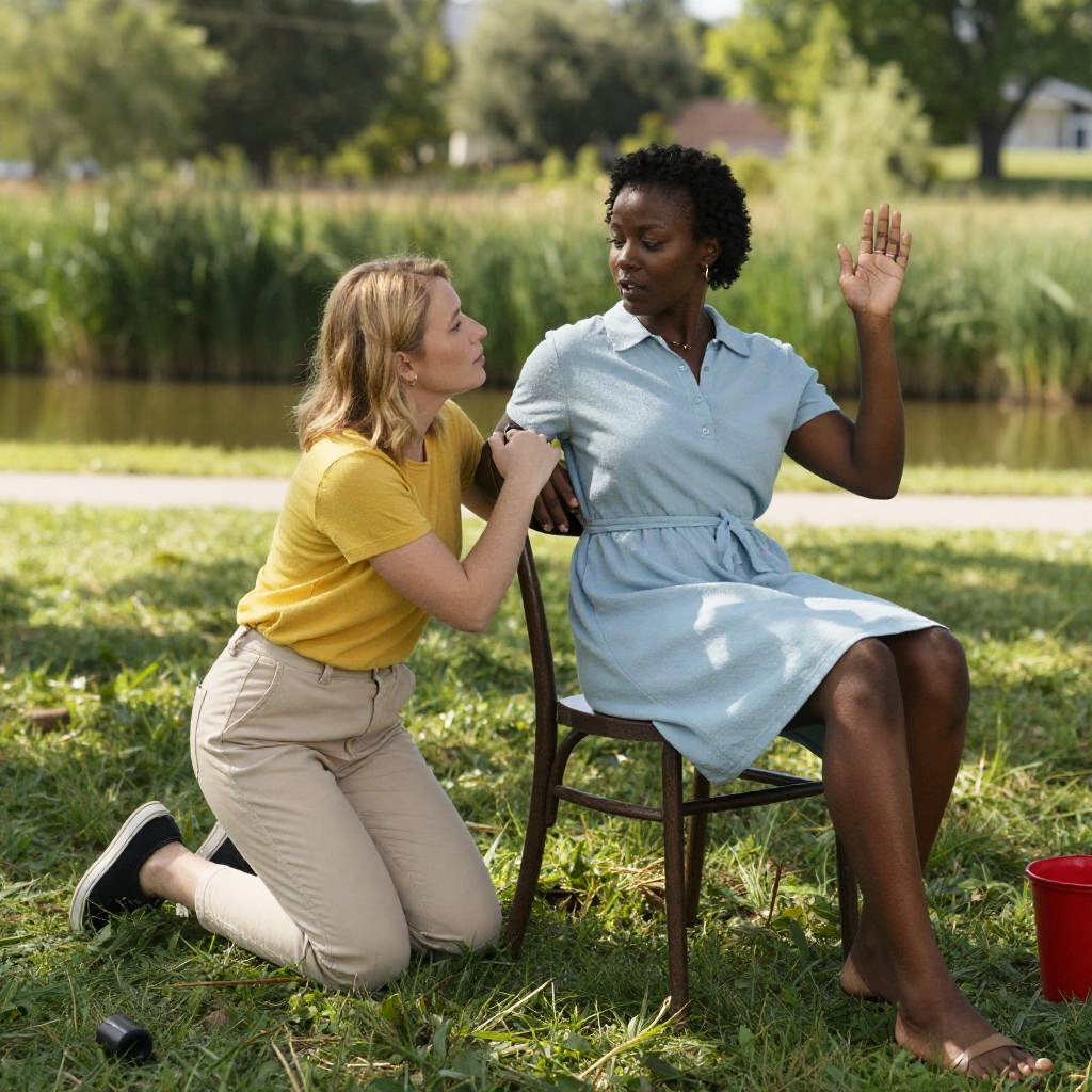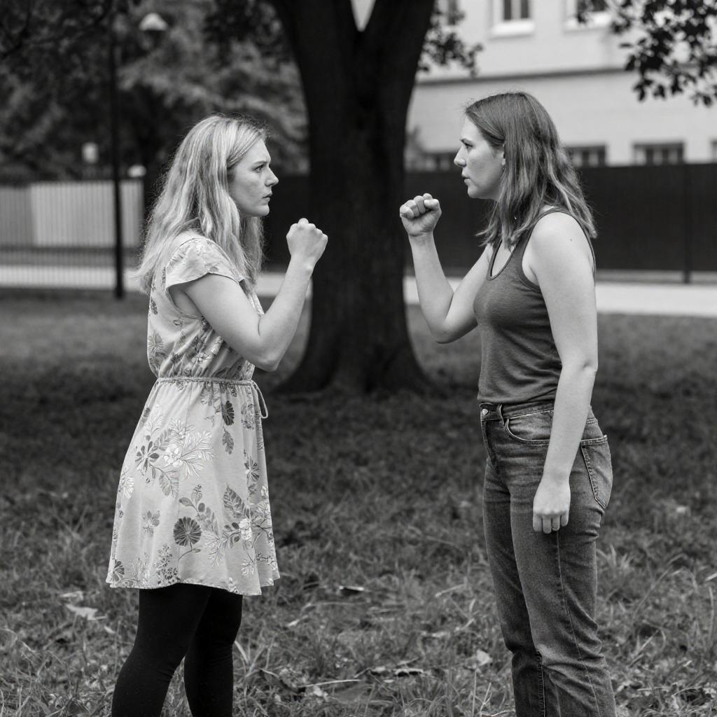 Black and white photograph of two women in a park, mid-argument. Both women have light-colored hair; one wears a floral dress and black leggings, the other a tank top and jeans. They face each other with fists raised, standing on grass. Background includes a large tree, fence, and building. Both women's expressions are intense.