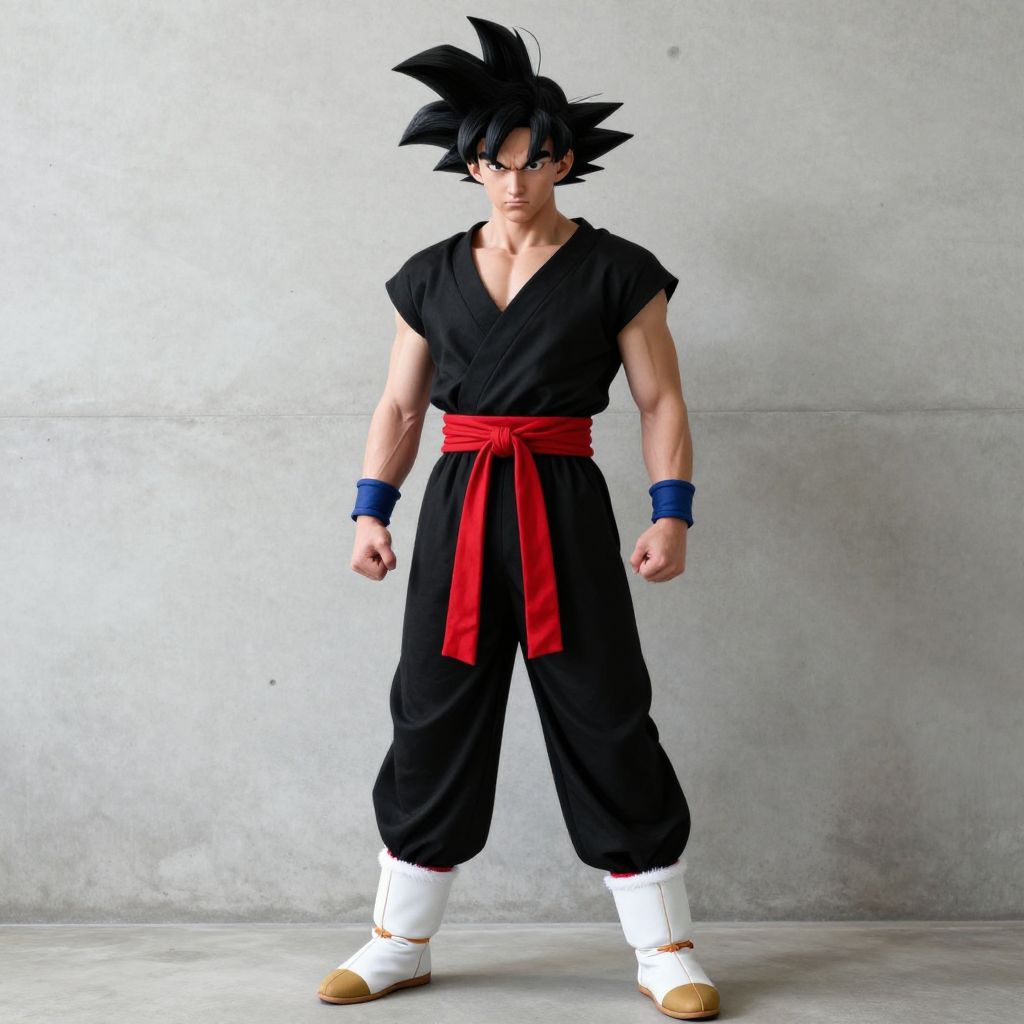 Photograph of a chibi-style, black-haired, anime-inspired Son Goku figurine with orange gi, blue belt, holding a Kamehame