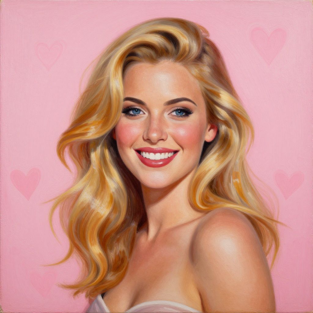 A vibrant oil painting by John Larriva titled \"Brassy,\" featuring a woman with flowing blonde hair and a radiant smile, set against a soft pink background adorned with subtle heart motifs, showcasing a blend of realism and fine artistry.