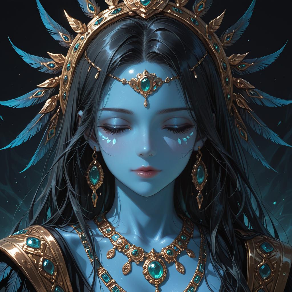 Digital artwork of a young woman with brown eyes and black hair wearing an ornate black hooded cloak decorated with gold trim. She has detailed blue gemstone jewelry including earrings, a forehead pendant, and a necklace. The portrait captures a moonlit night sky background with clouds and stars, enhancing the mystical and elegant atmosphere. The character has subtle makeup with red lips and a soft expression, looking directly at the viewer.