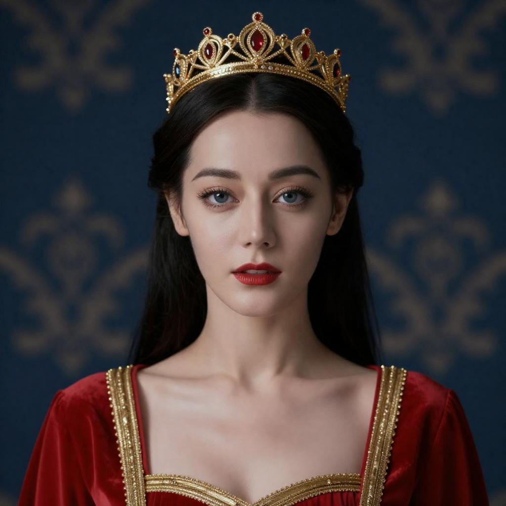 A woman dressed in a regal queen costume with intricate details and a magnificent crown, captured in cinematic realism style. Her poised expression, elegant attire, and the dramatic lighting evoke a powerful and majestic editorial portrait.
