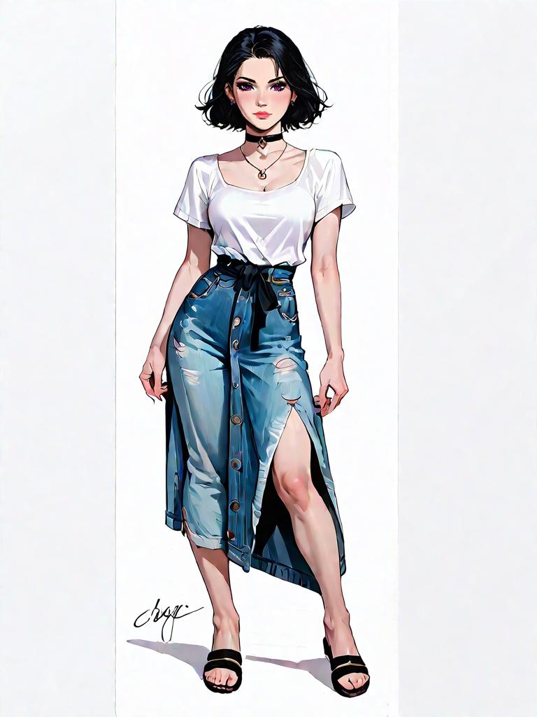 1girl, source_comics, realistic face, full body shot, Woman, contemporary edgy, black wrap dress with deep V-neck, short sleeves, thigh-high front slit, waist tie closure, choker necklace, denim shorts, strappy flat sandals, white backdrop.