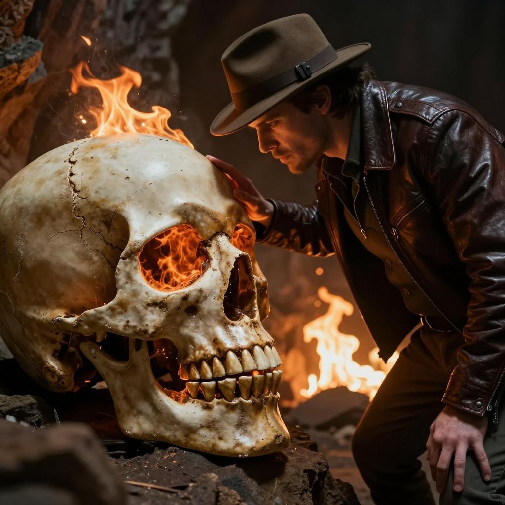 A man in a brown hat and dark leather jacket touches a large, glowing skull with fiery eyes in a dimly lit cave. Flames illuminate the background. The man leans forward, right hand on the skull. The skull is ured and weathered. The scene is intense and dramatic.