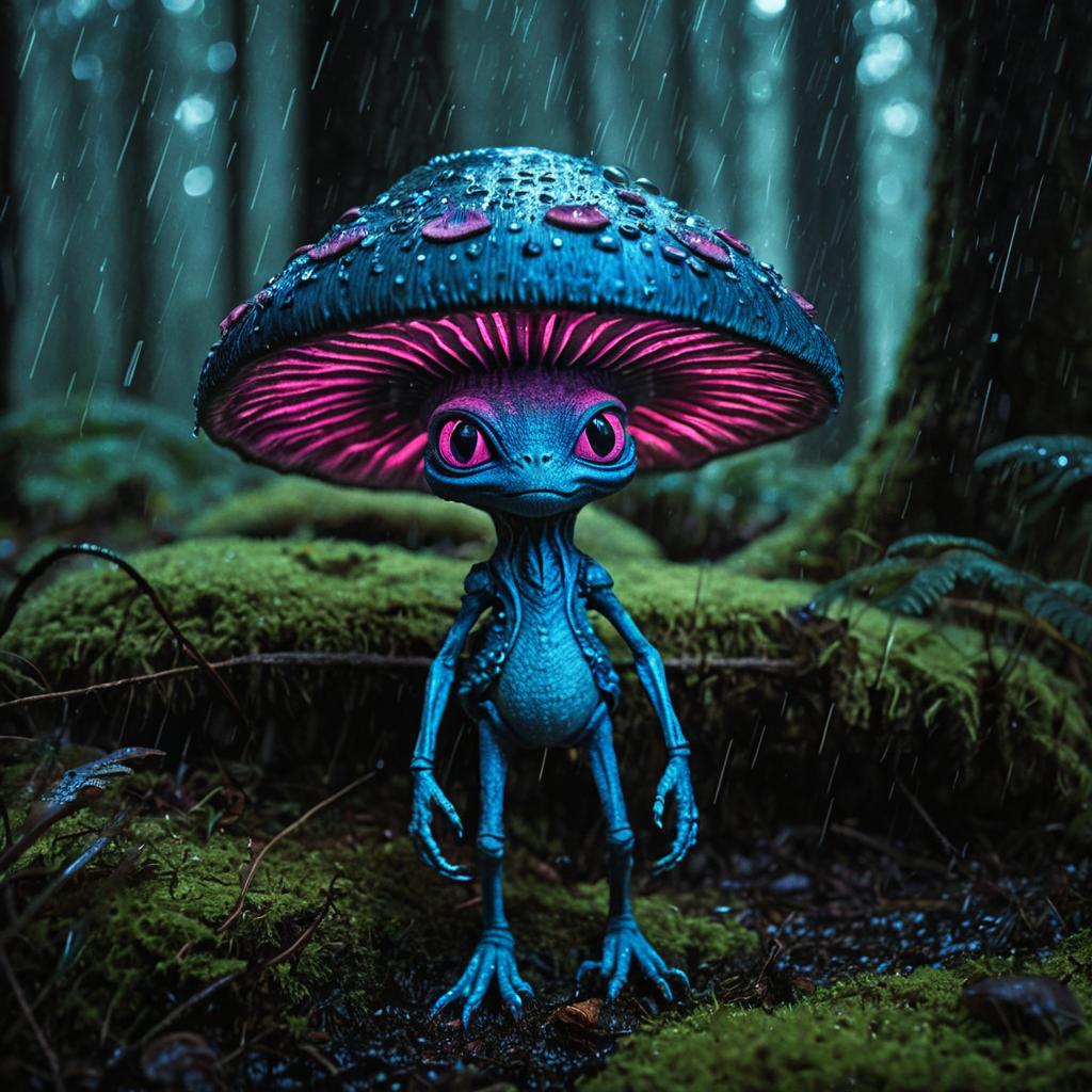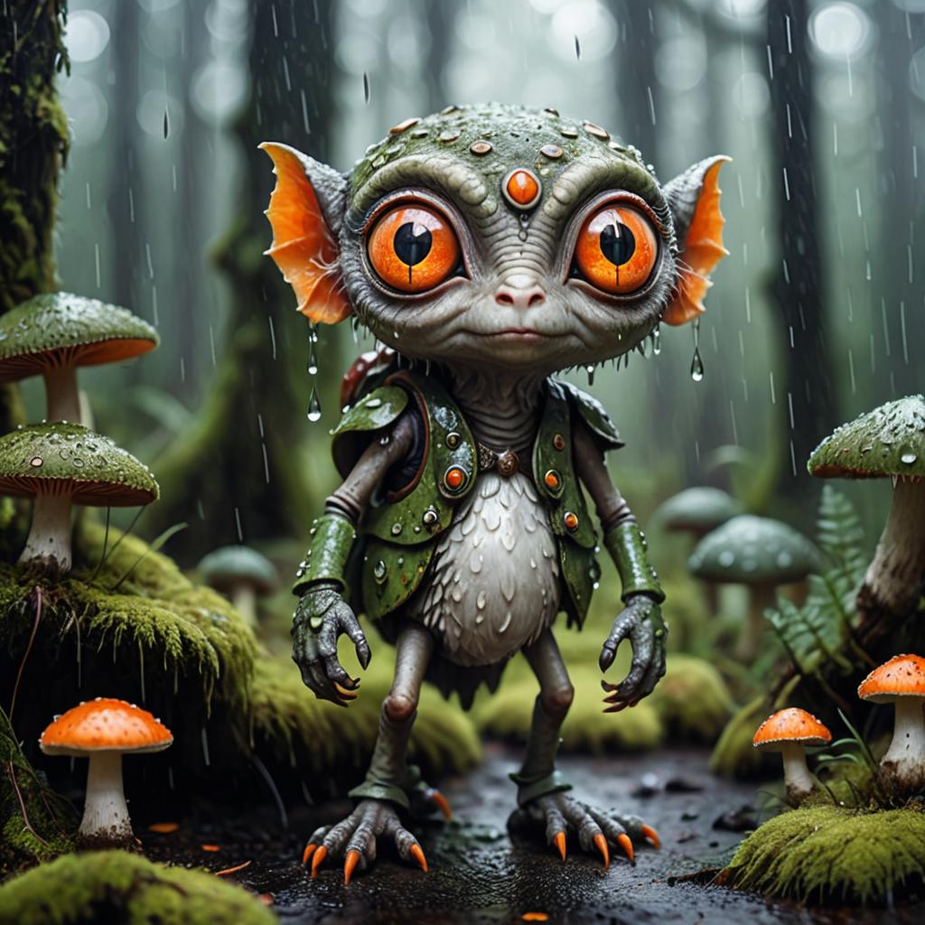 A detailed depiction of a small alien-like monster with an orange mushroom cap as a head, large glowing orange eyes, sharp claws, and a textured blue body. The creature stands upright on a wet rock outdoors in the rain, surrounded by grass and other mushrooms, with a blurred natural background.