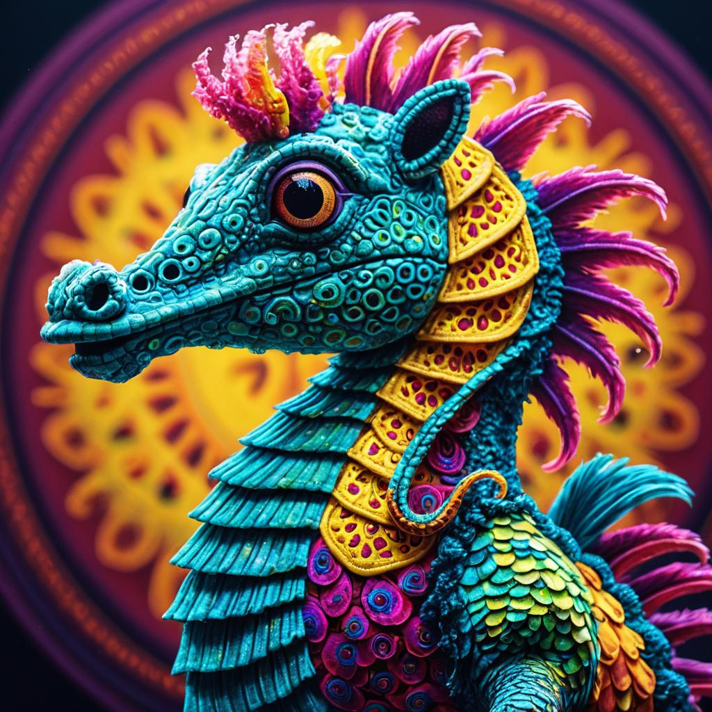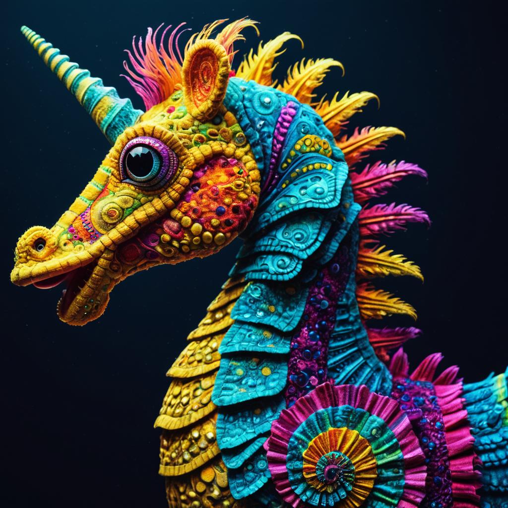 Realistic animal muppet of a seahorse, inspired by Lisa Frank, photorealistic with surreal psychedelic details, highly intricate, trending on ArtStation, UHD, the rule of thirds, golden ratio, and very intricate details.